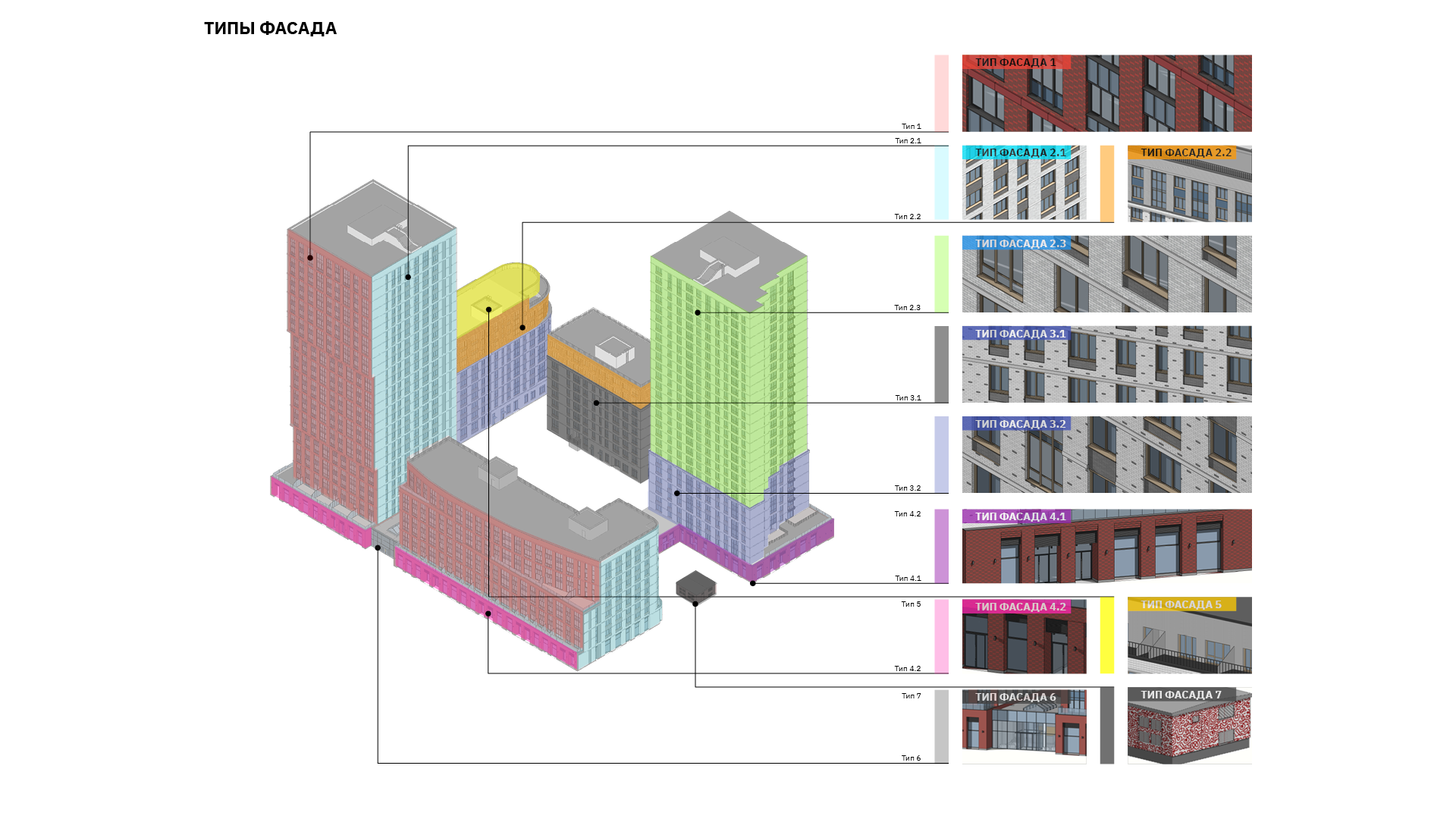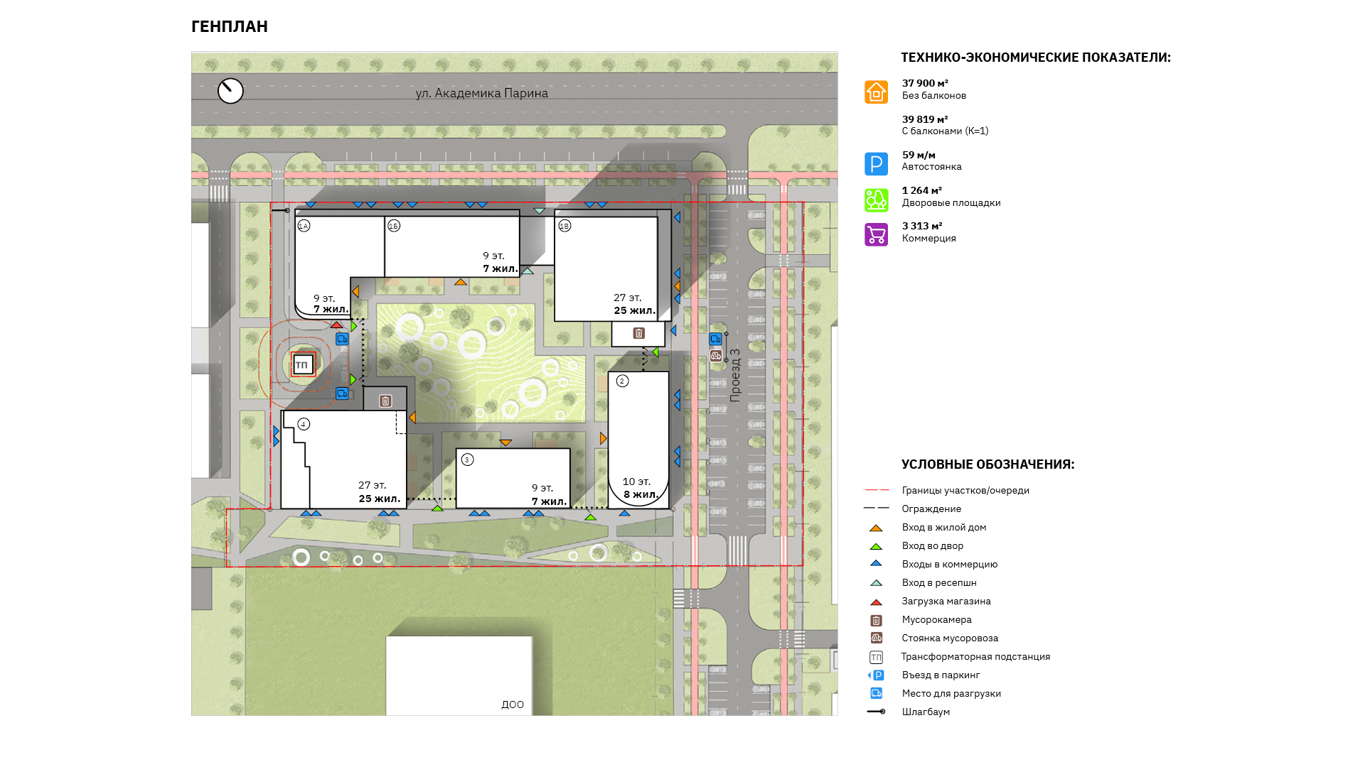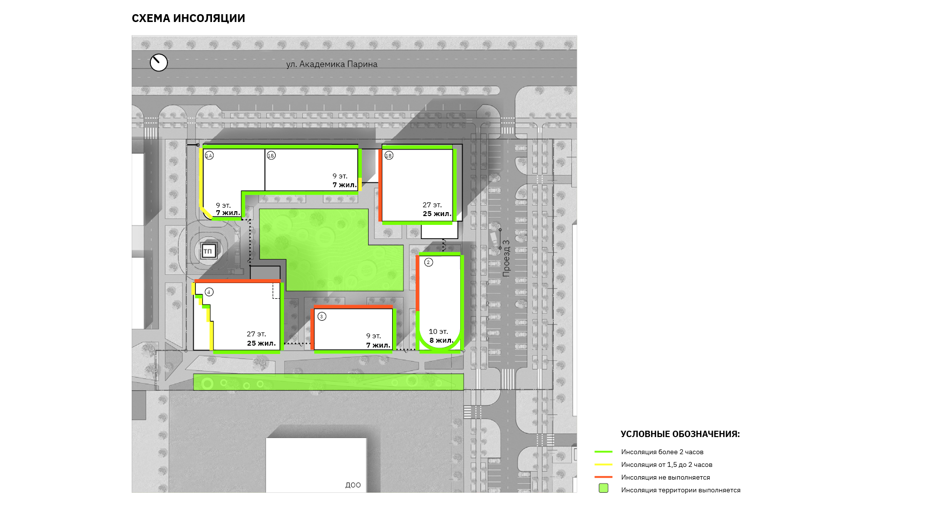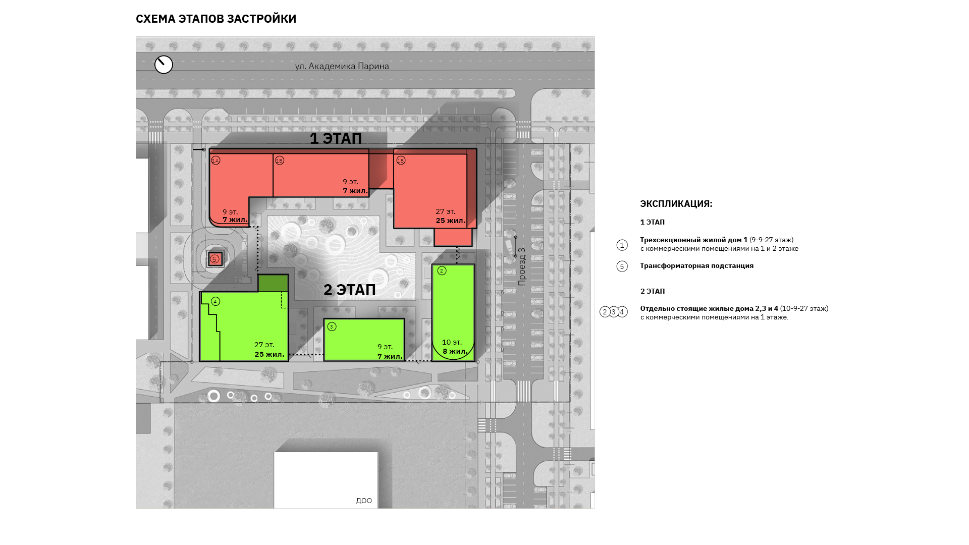 Квартал сформирован периметральной застройкой, в которой около 70% секций решено в базовой этажности – до 9 этажей. Два высотных дома (27 этажей) находятся в угловых частях квартала, чтобы избежать их скопления. Здание, которое выходит на ул. Парина, также играет роль локальной доминанты.
