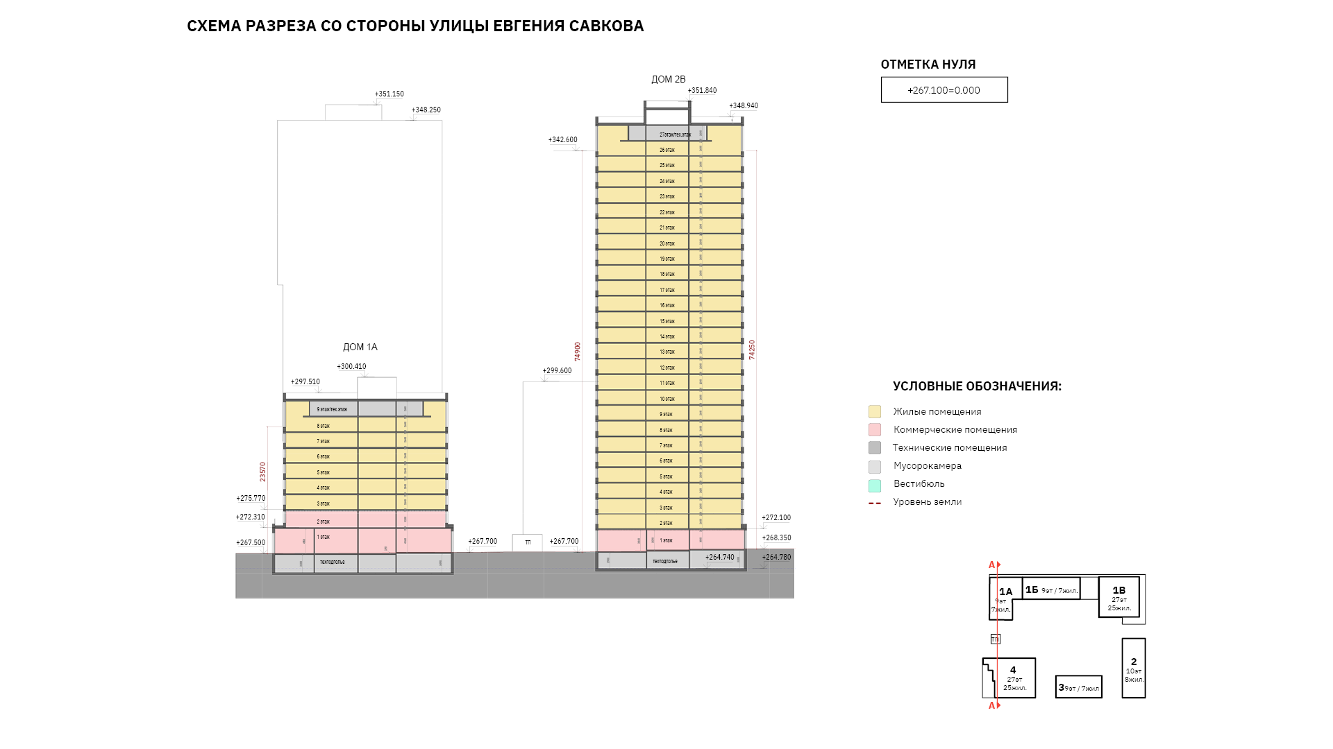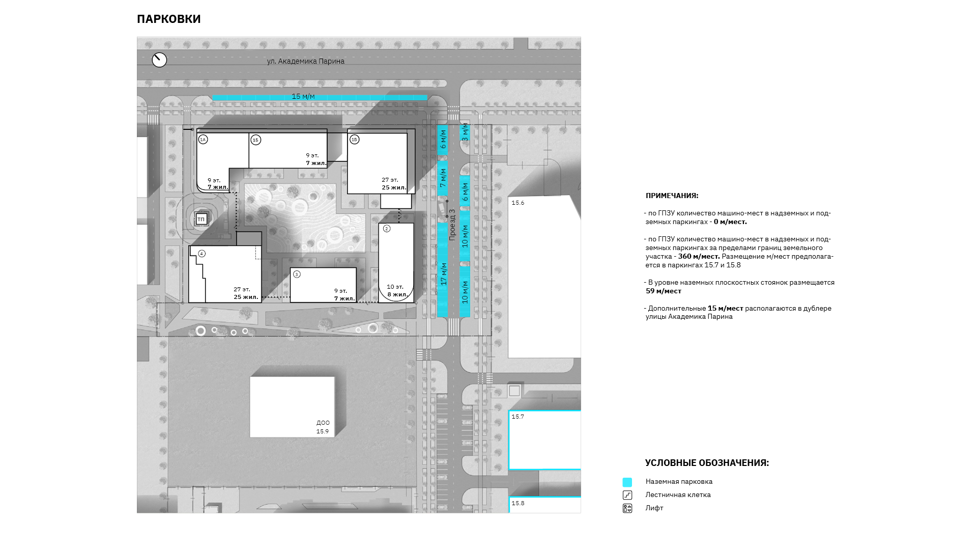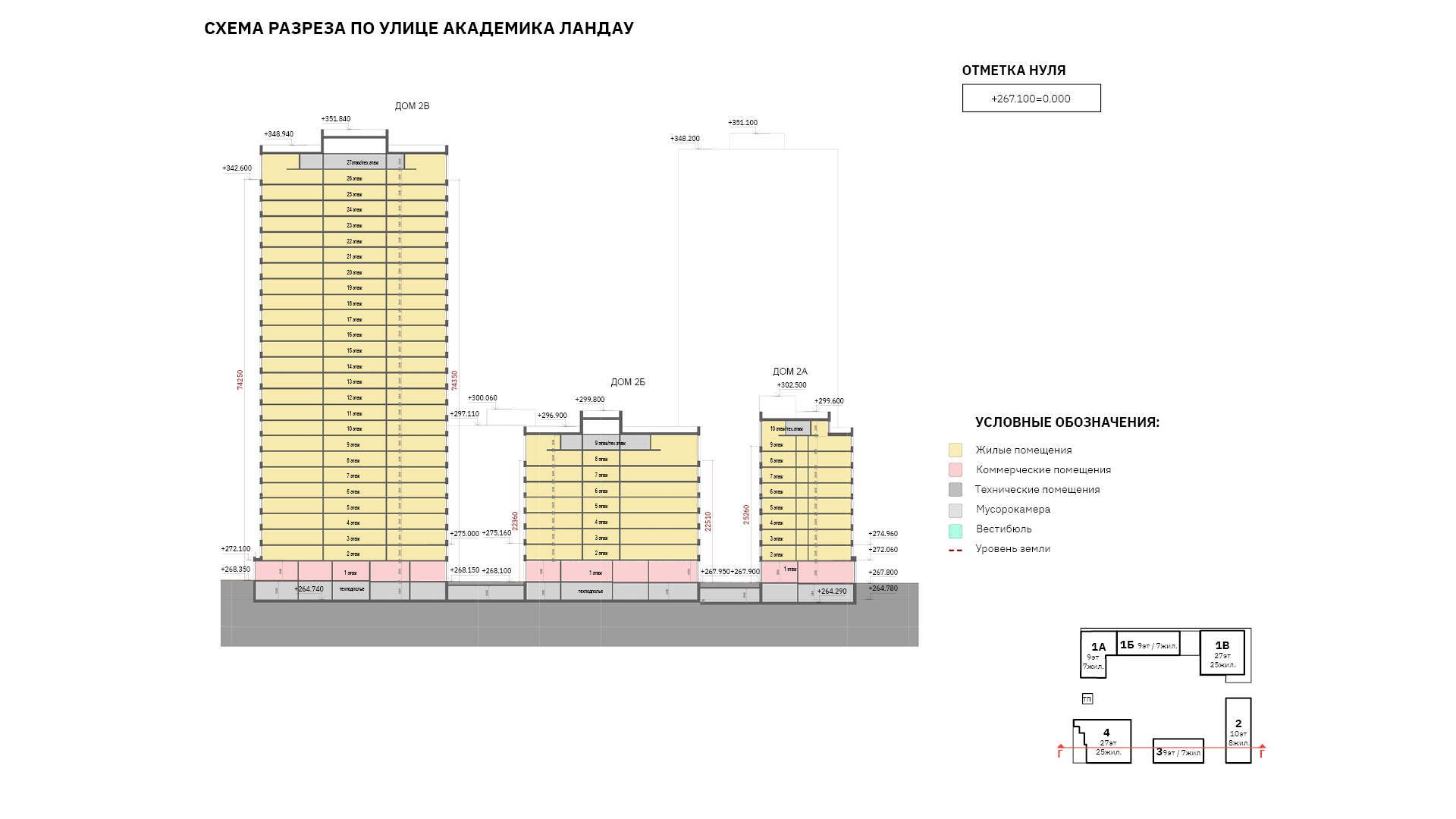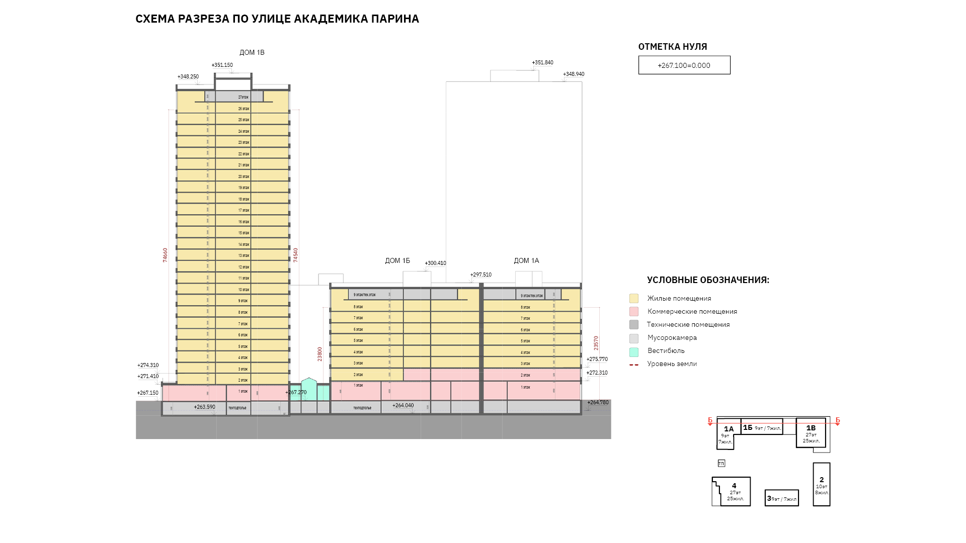 Квартал сформирован периметральной застройкой, в которой около 70% секций решено в базовой этажности – до 9 этажей. Два высотных дома (27 этажей) находятся в угловых частях квартала, чтобы избежать их скопления. Здание, которое выходит на ул. Парина, также играет роль локальной доминанты.