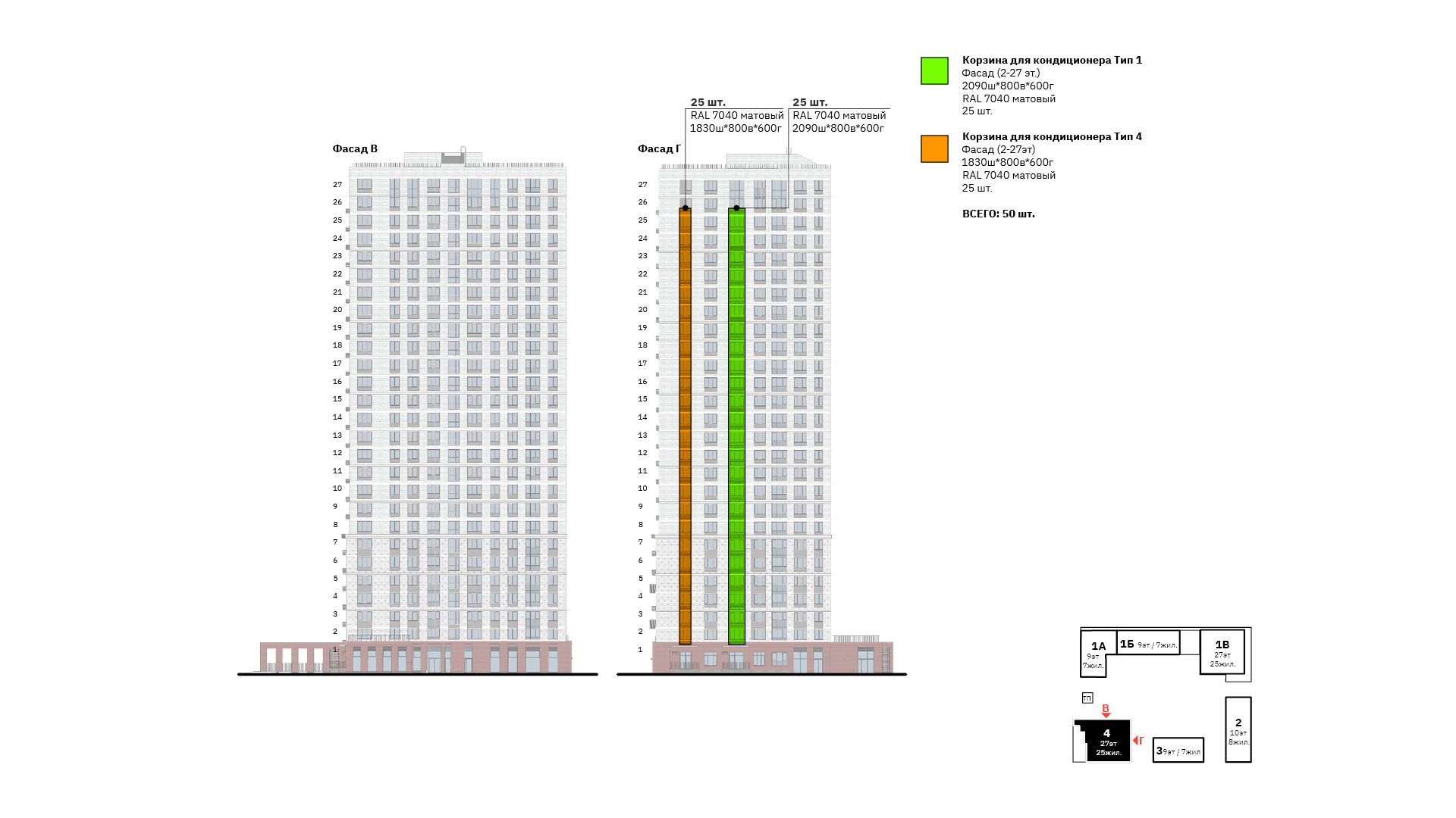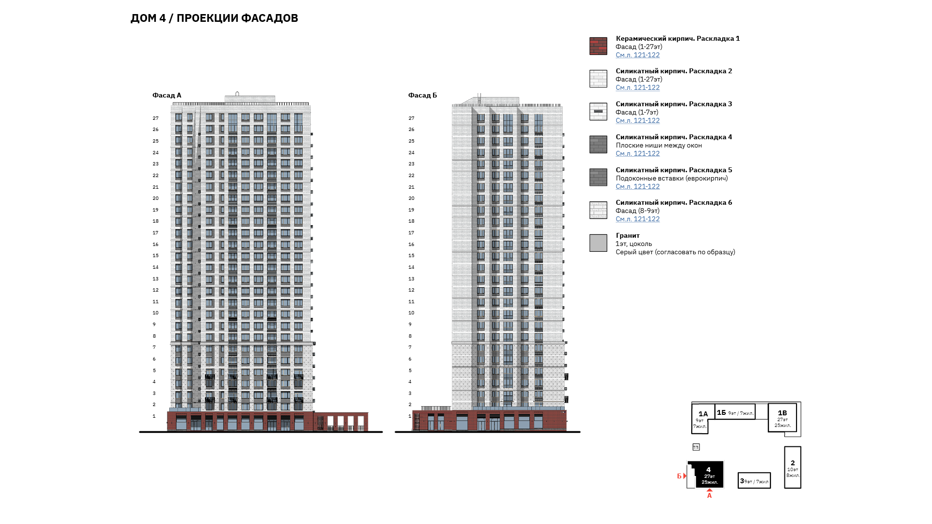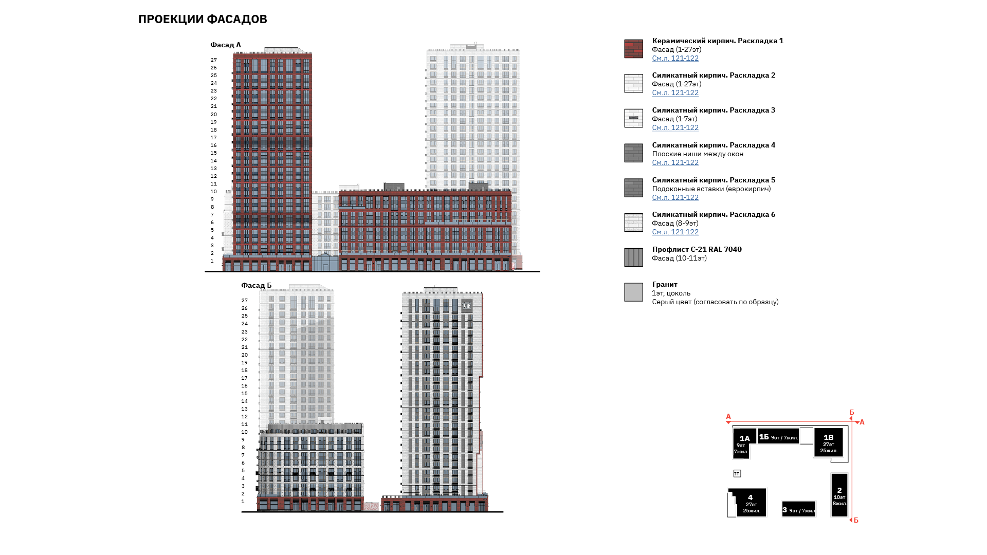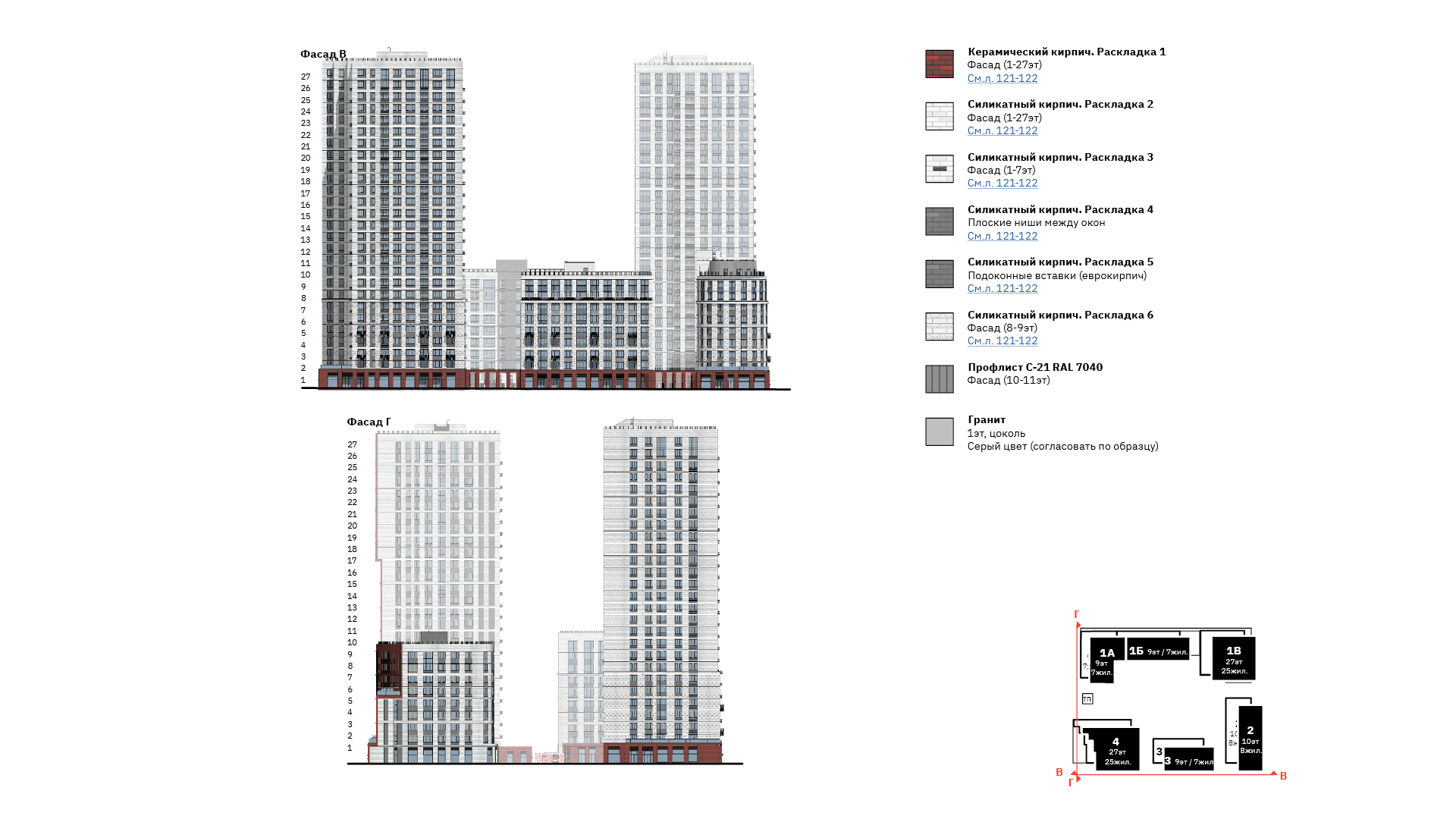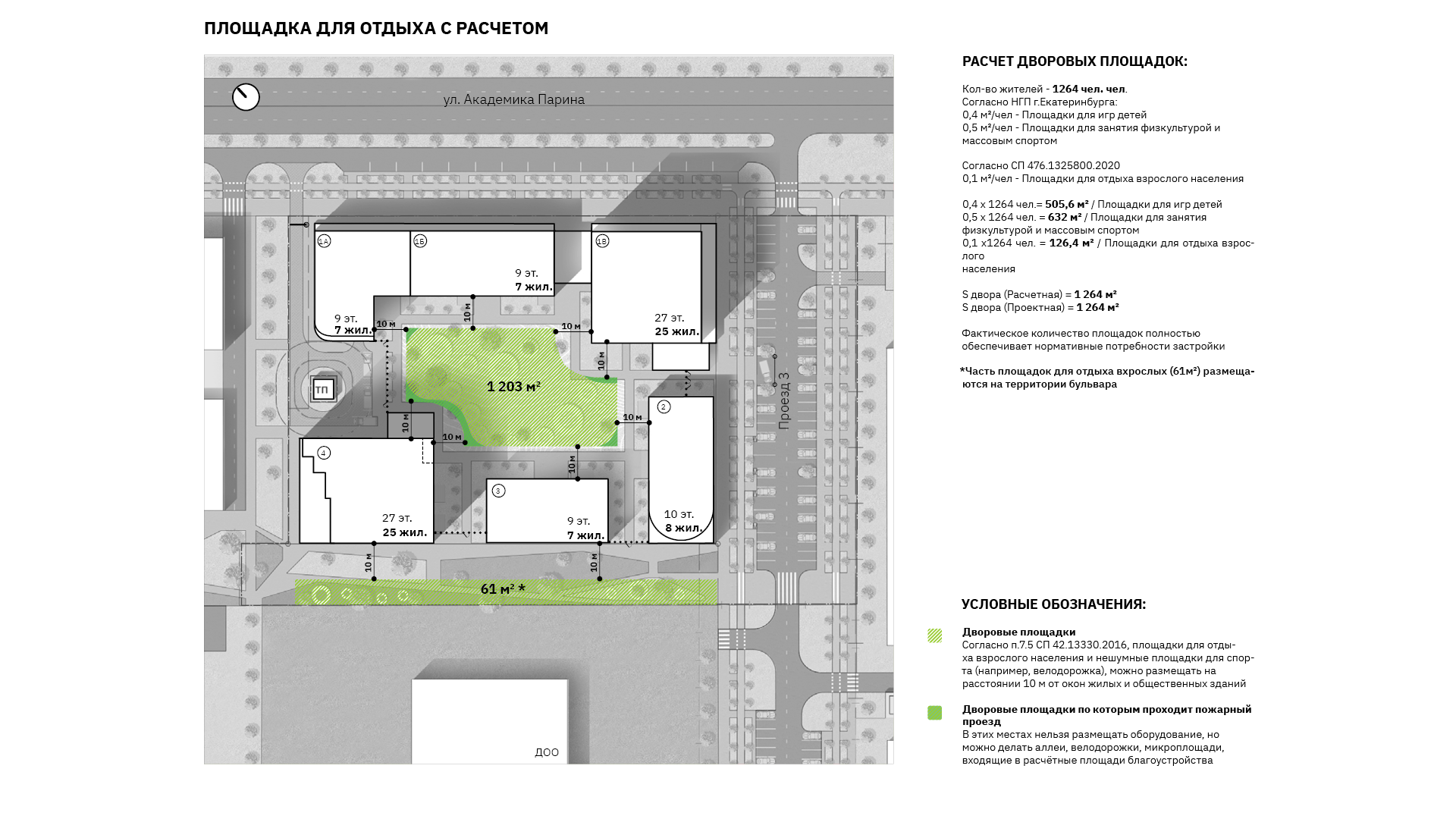 Квартал сформирован периметральной застройкой, в которой около 70% секций решено в базовой этажности – до 9 этажей. Два высотных дома (27 этажей) находятся в угловых частях квартала, чтобы избежать их скопления. Здание, которое выходит на ул. Парина, также играет роль локальной доминанты.