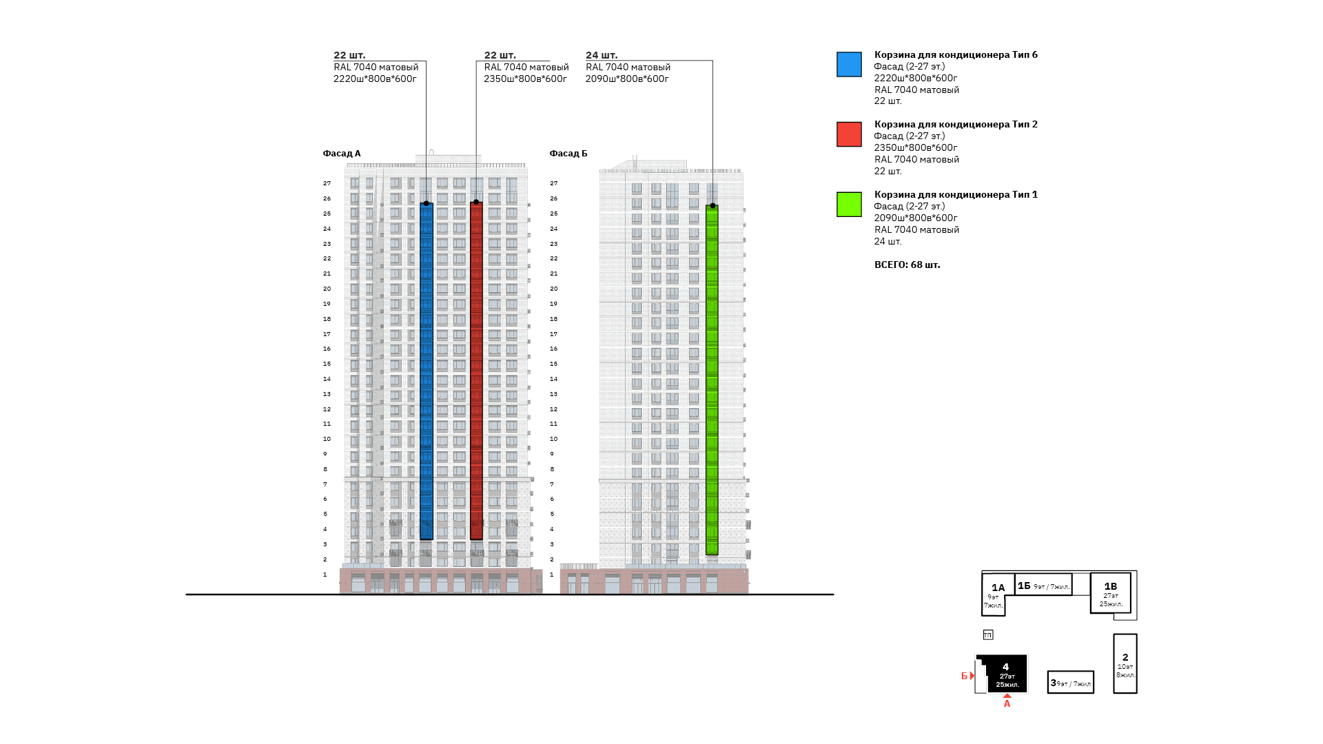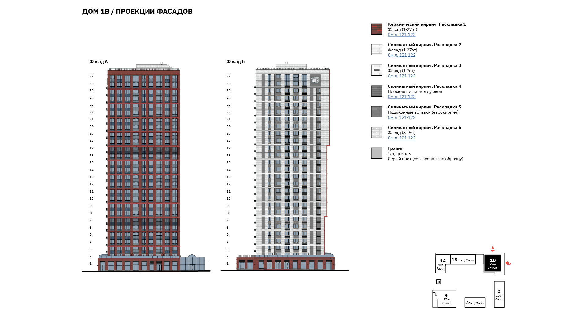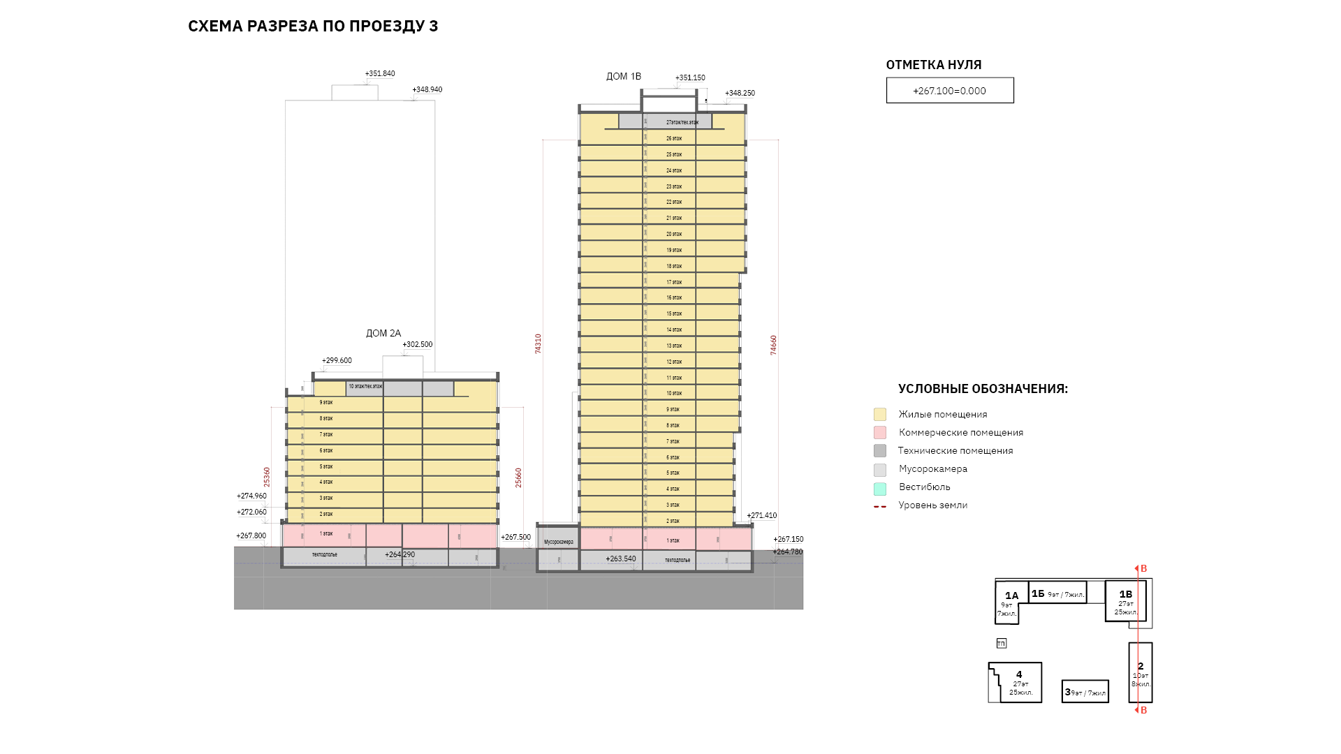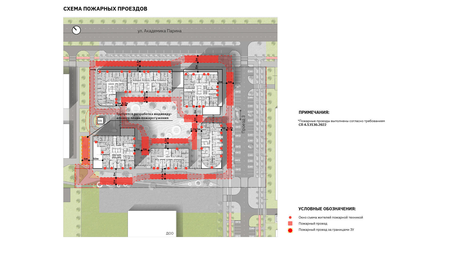 Квартал сформирован периметральной застройкой, в которой около 70% секций решено в базовой этажности – до 9 этажей. Два высотных дома (27 этажей) находятся в угловых частях квартала, чтобы избежать их скопления. Здание, которое выходит на ул. Парина, также играет роль локальной доминанты.