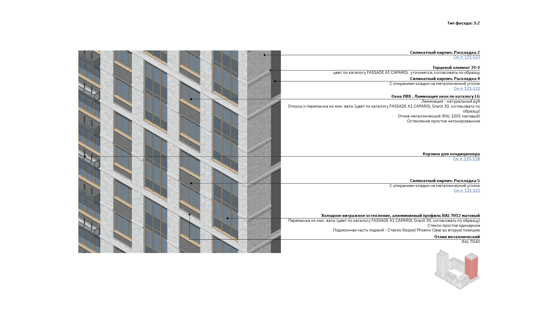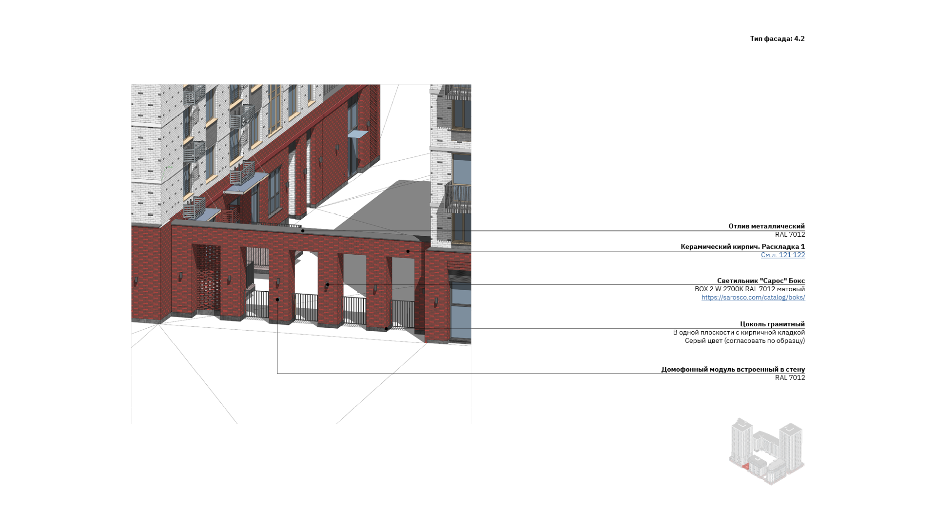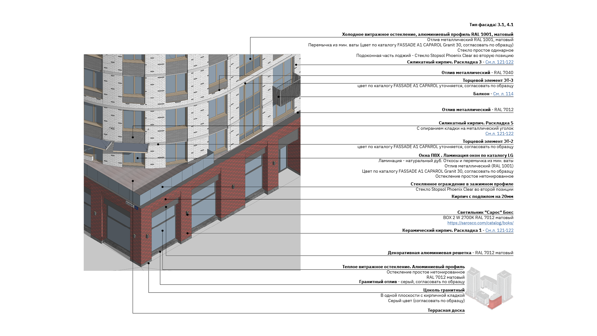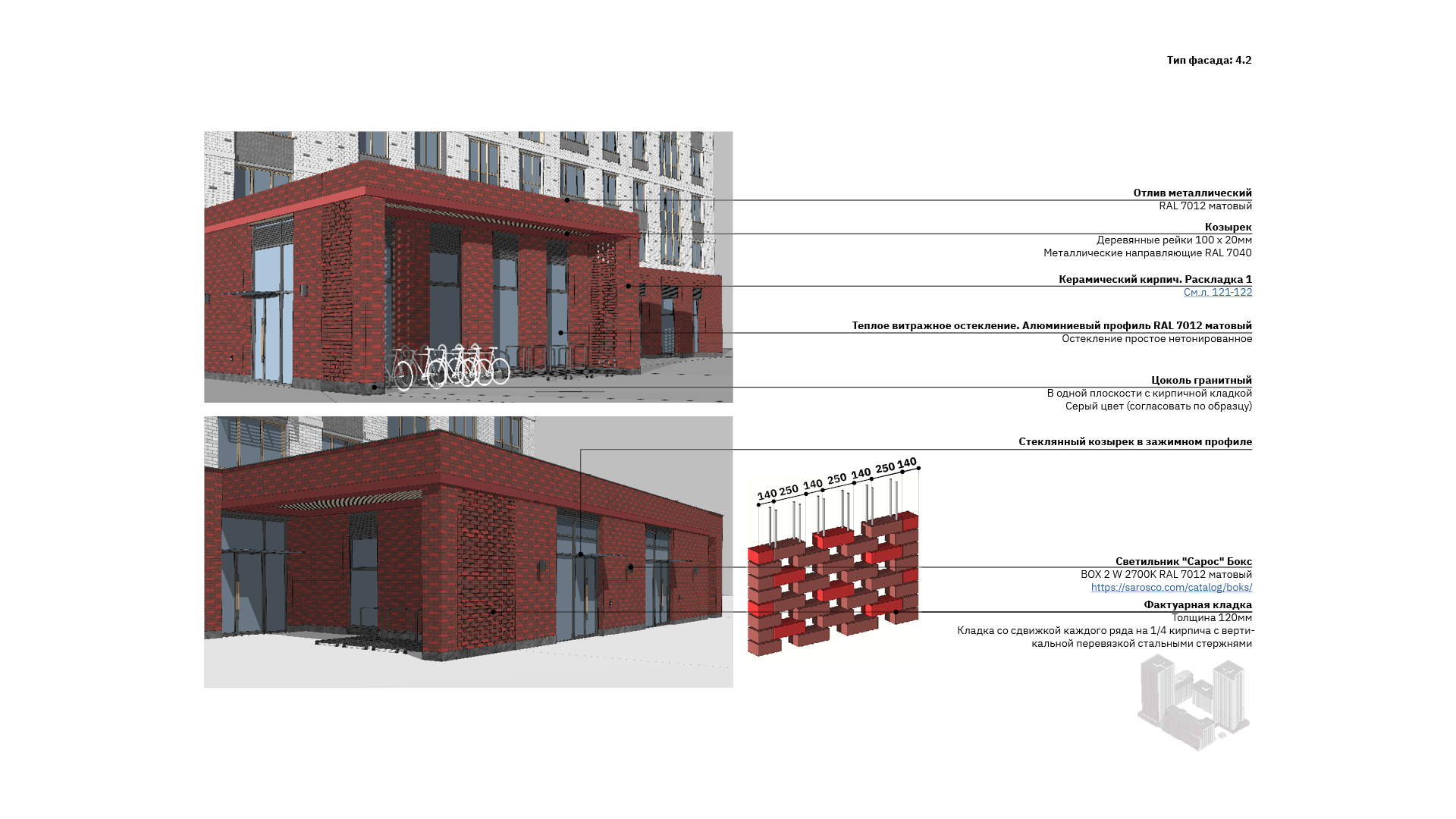 Остальные фасады выполнены контрастно – в сдержанном ключе, чтобы не акцентировать внимание на архитектуре. Отсюда монохромное решение в бело-сером кирпиче с оконными рамами, оформленными под дерево. Красным кирпичом выделен только первый этаж – для большей торжественности, поскольку он отведен под коммерцию.