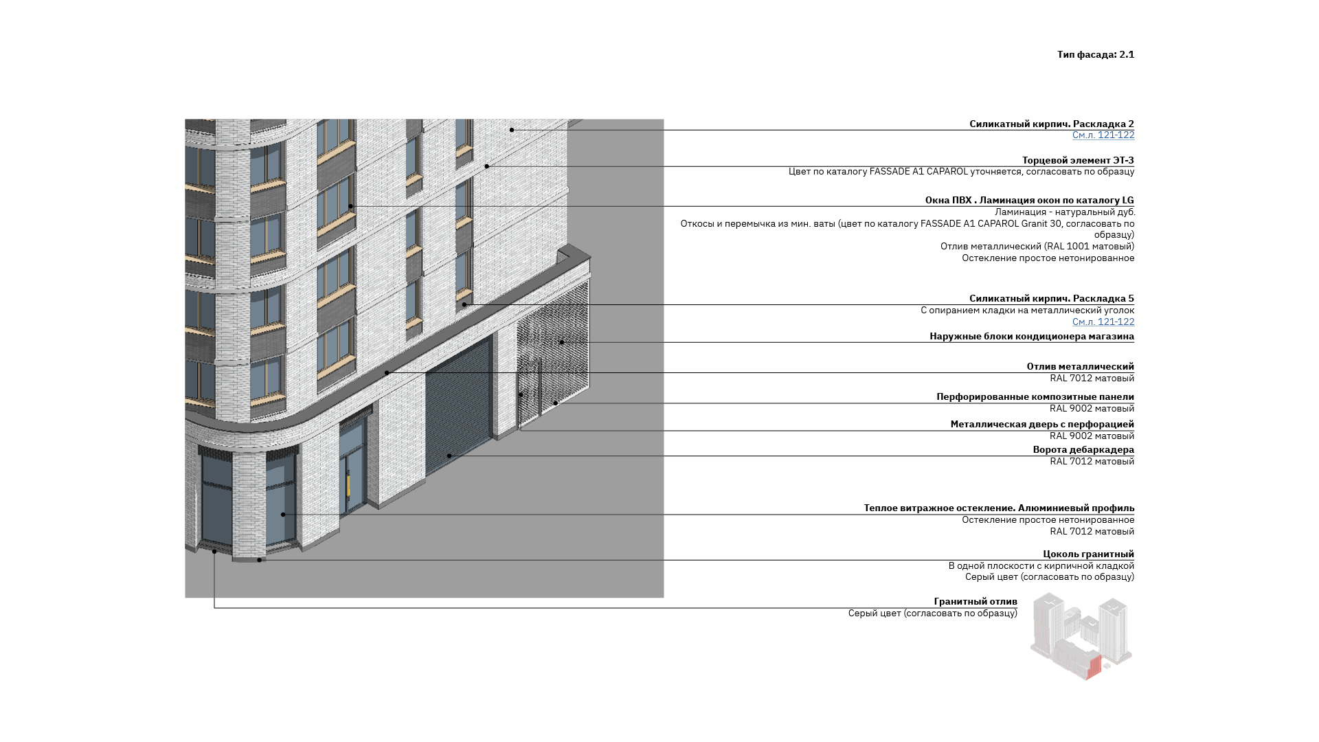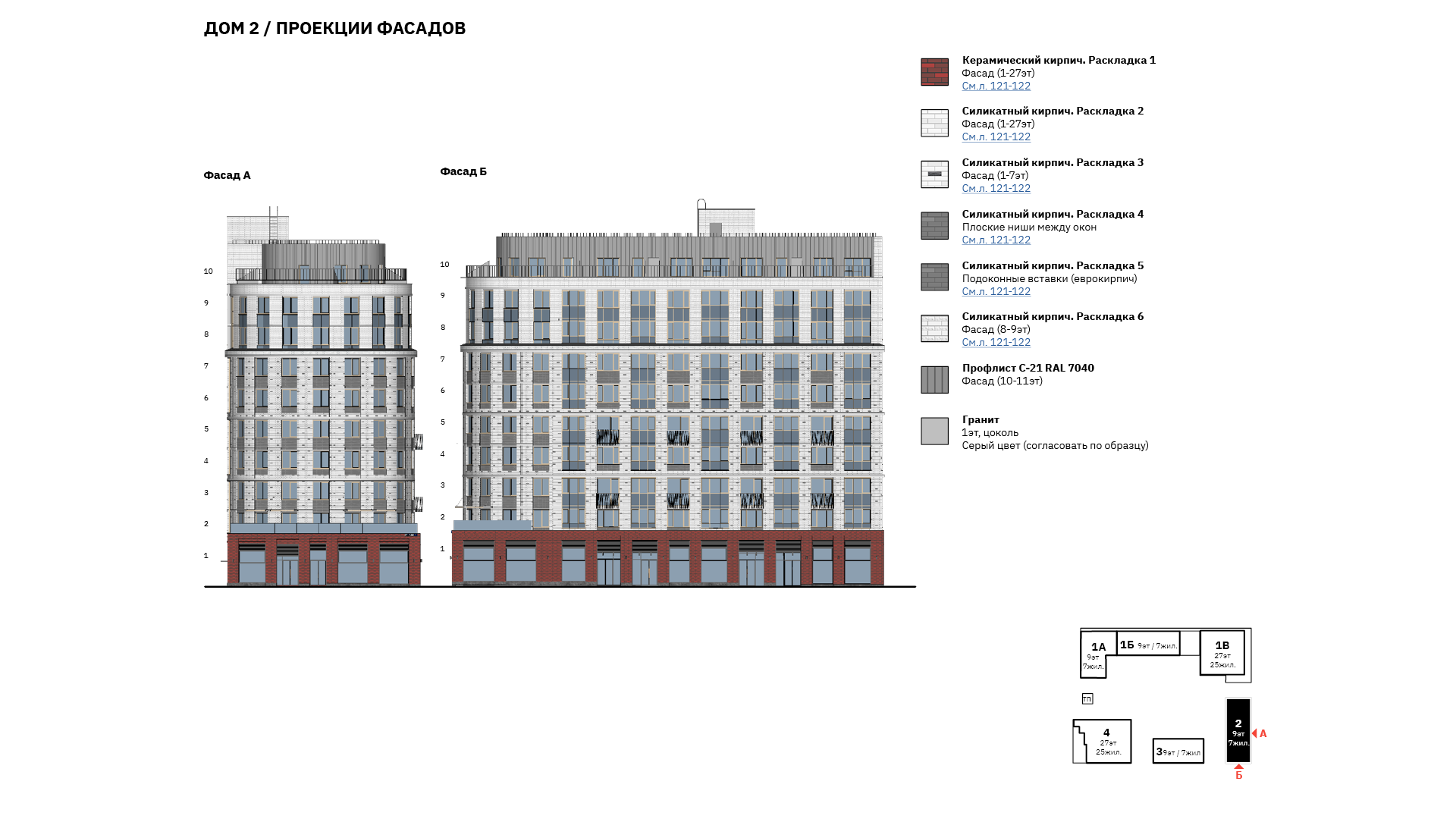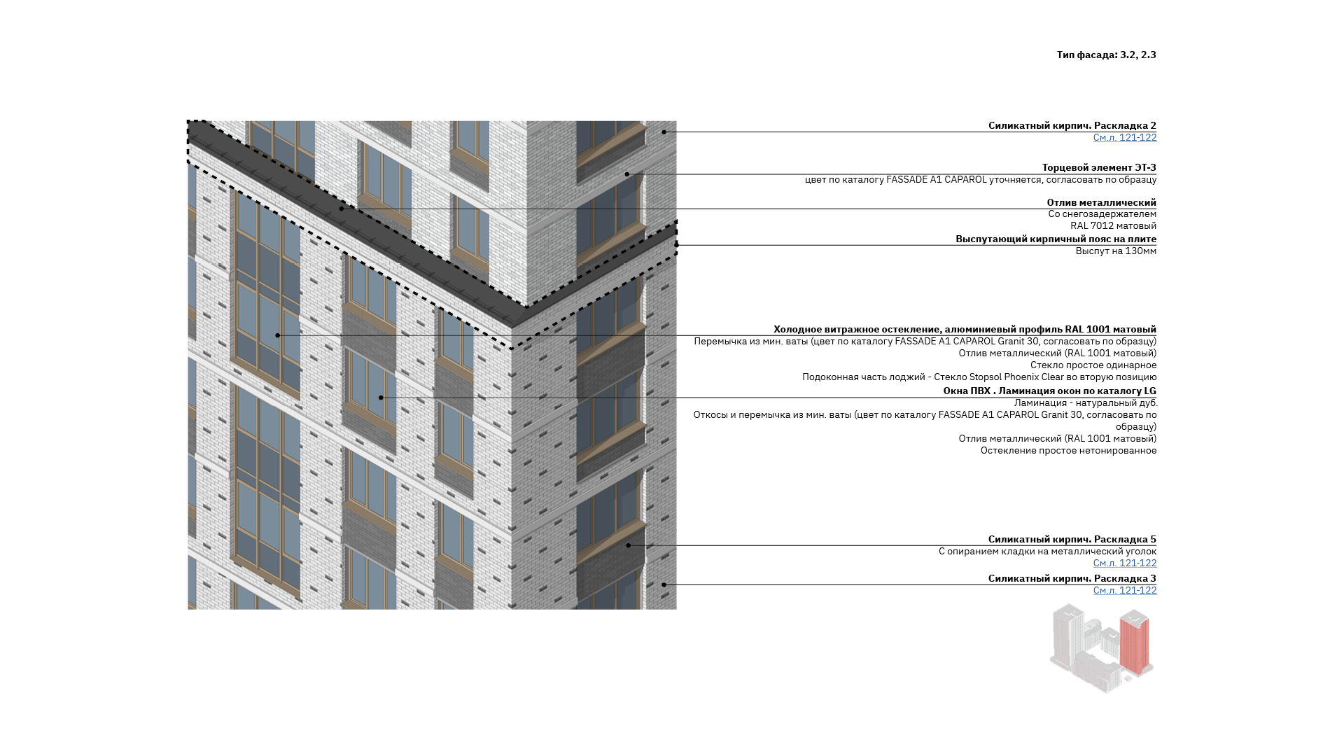 Остальные фасады выполнены контрастно – в сдержанном ключе, чтобы не акцентировать внимание на архитектуре. Отсюда монохромное решение в бело-сером кирпиче с оконными рамами, оформленными под дерево. Красным кирпичом выделен только первый этаж – для большей торжественности, поскольку он отведен под коммерцию.