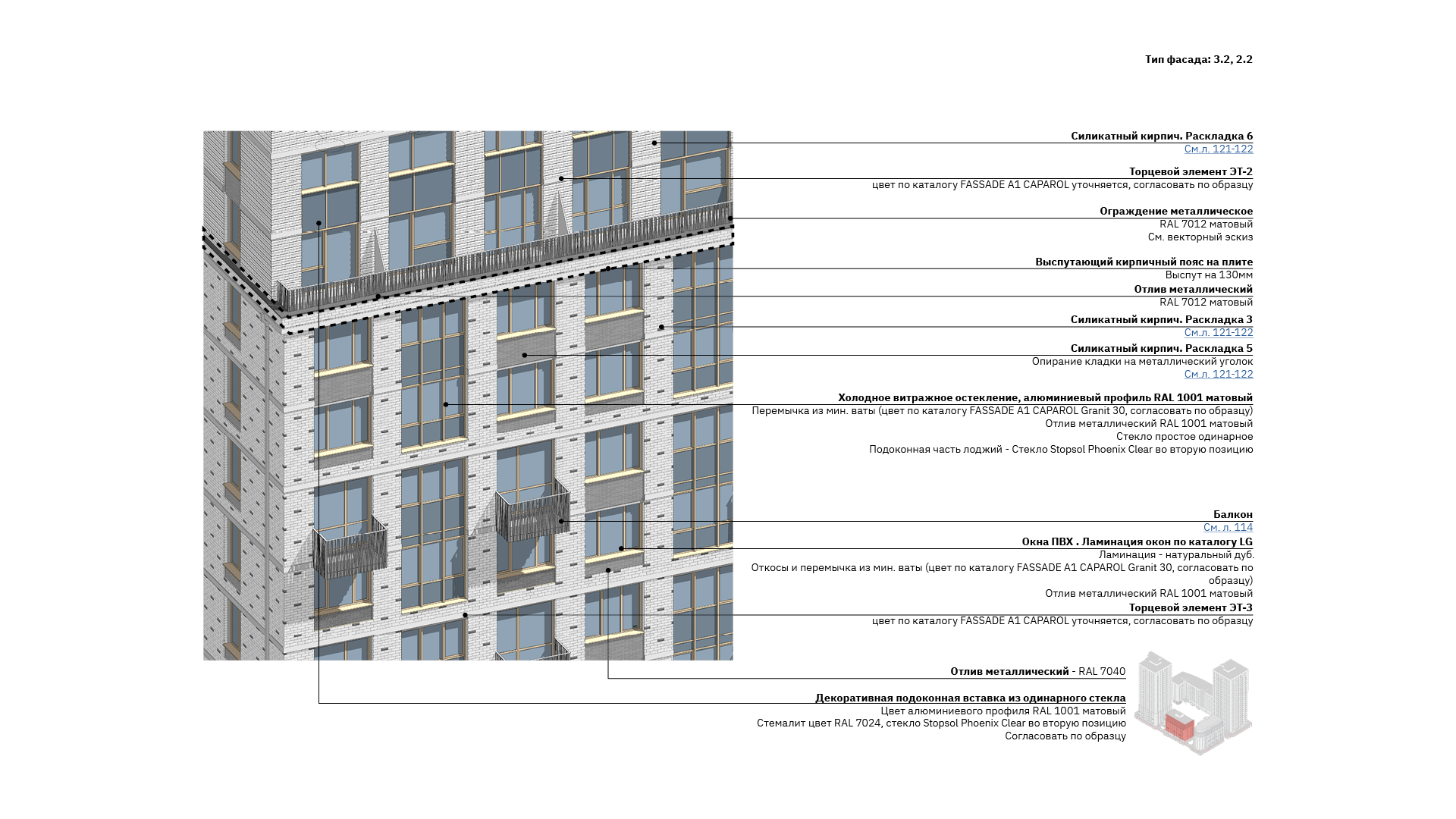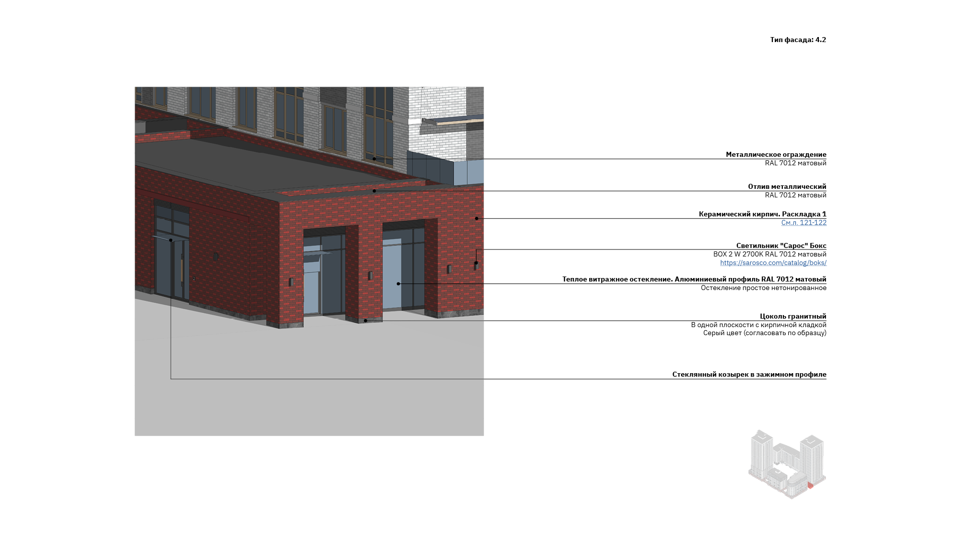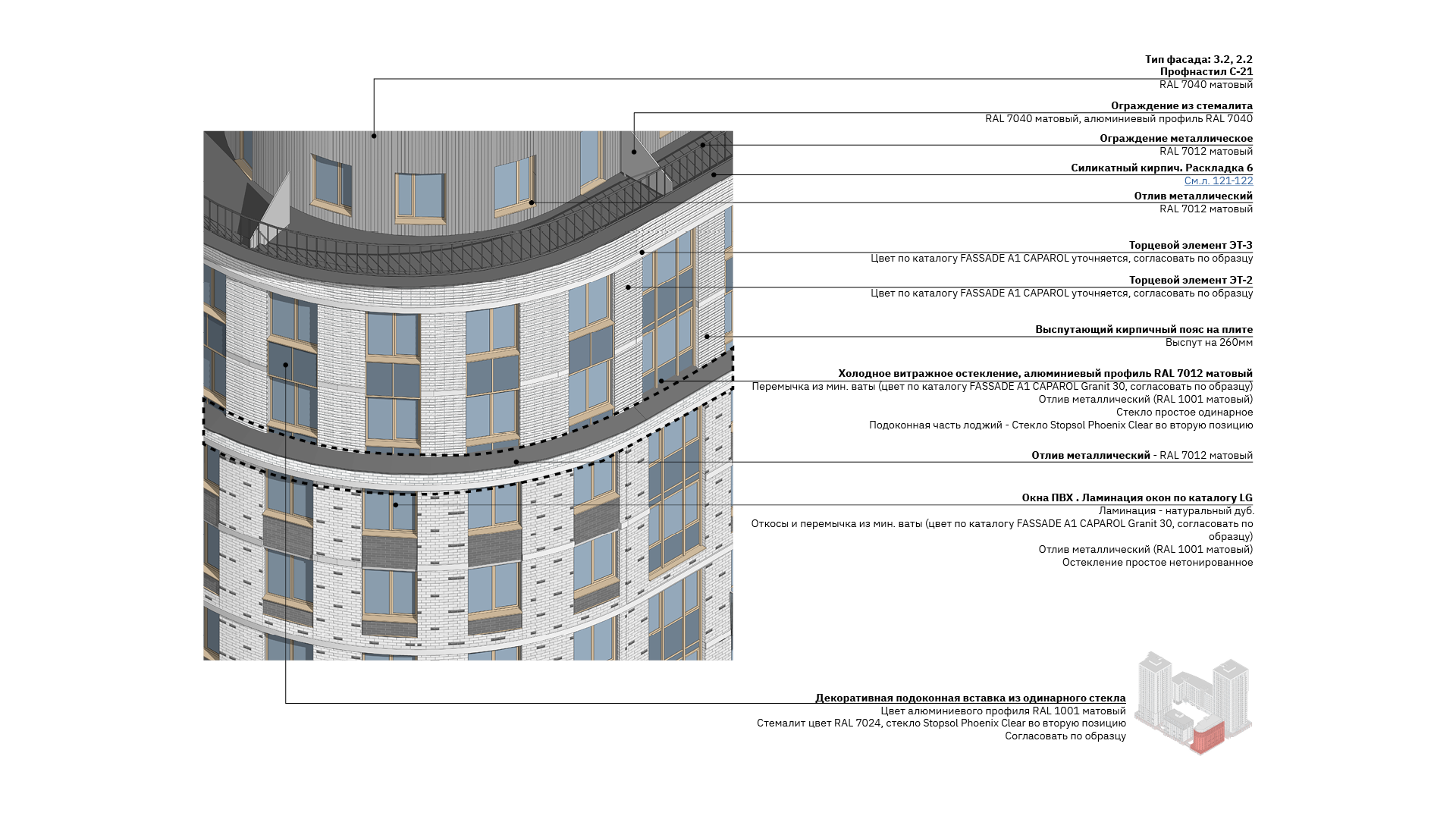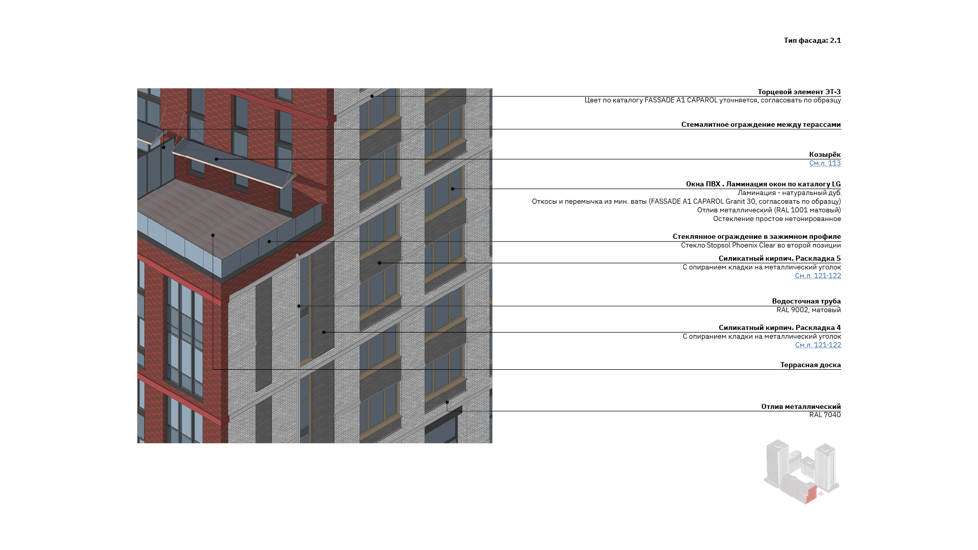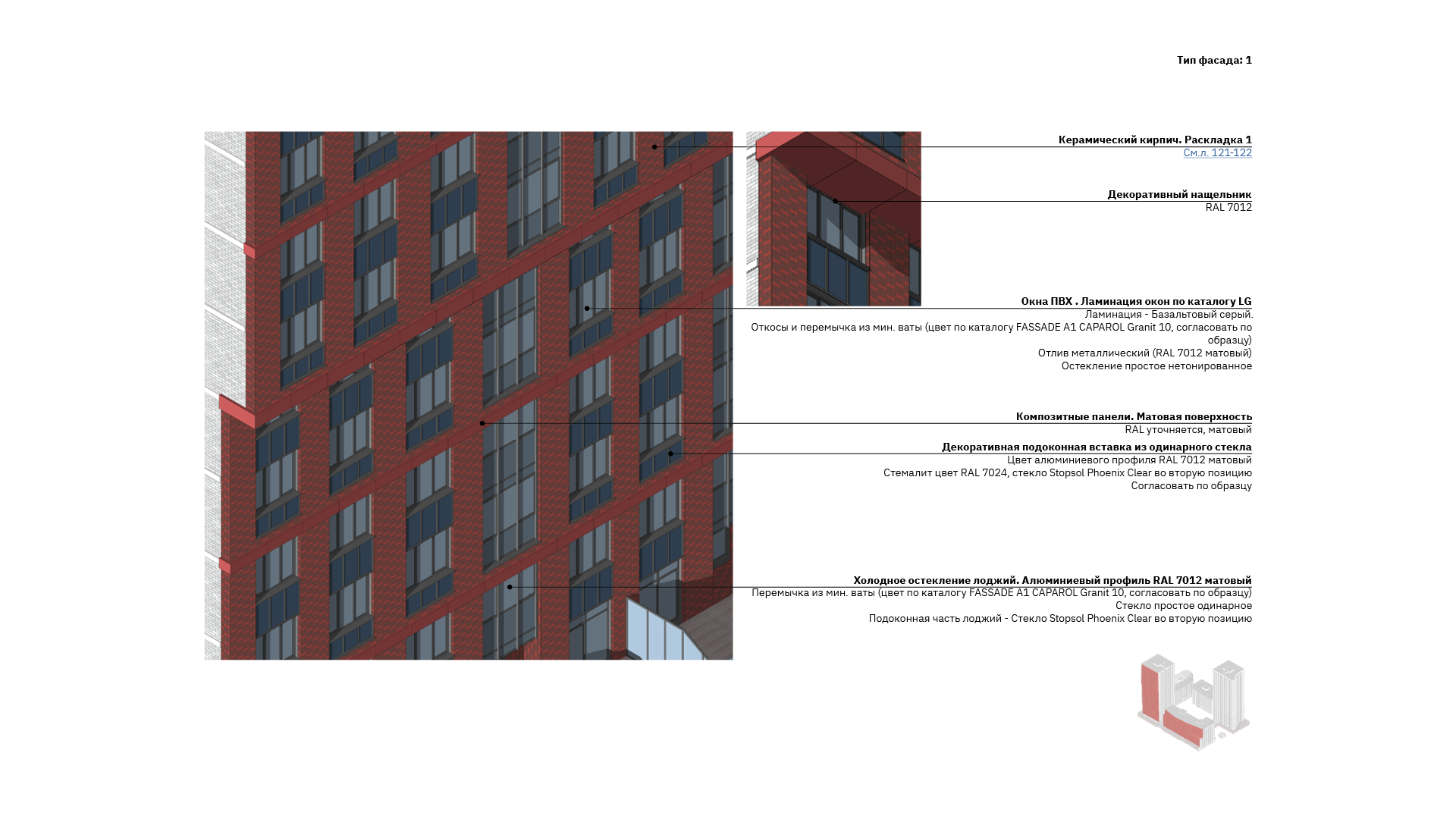 Парадный фасад отличается пластичностью. Он выходит на широкую ул. Парина, по которой проносятся машины, поэтому одинаково хорошо должен восприниматься и с ближних, и с дальних точек. Динамику усиливают выходящие из единой плоскости консоли у высотной башни, а также плавный изгиб девятиэтажной секции. Здания оформлены ярким красным кирпичом, причем кладка отличается уникальным сочетанием обычного терракотового и красного глазурованного кирпича с глянцевой, сияющей поверхностью.