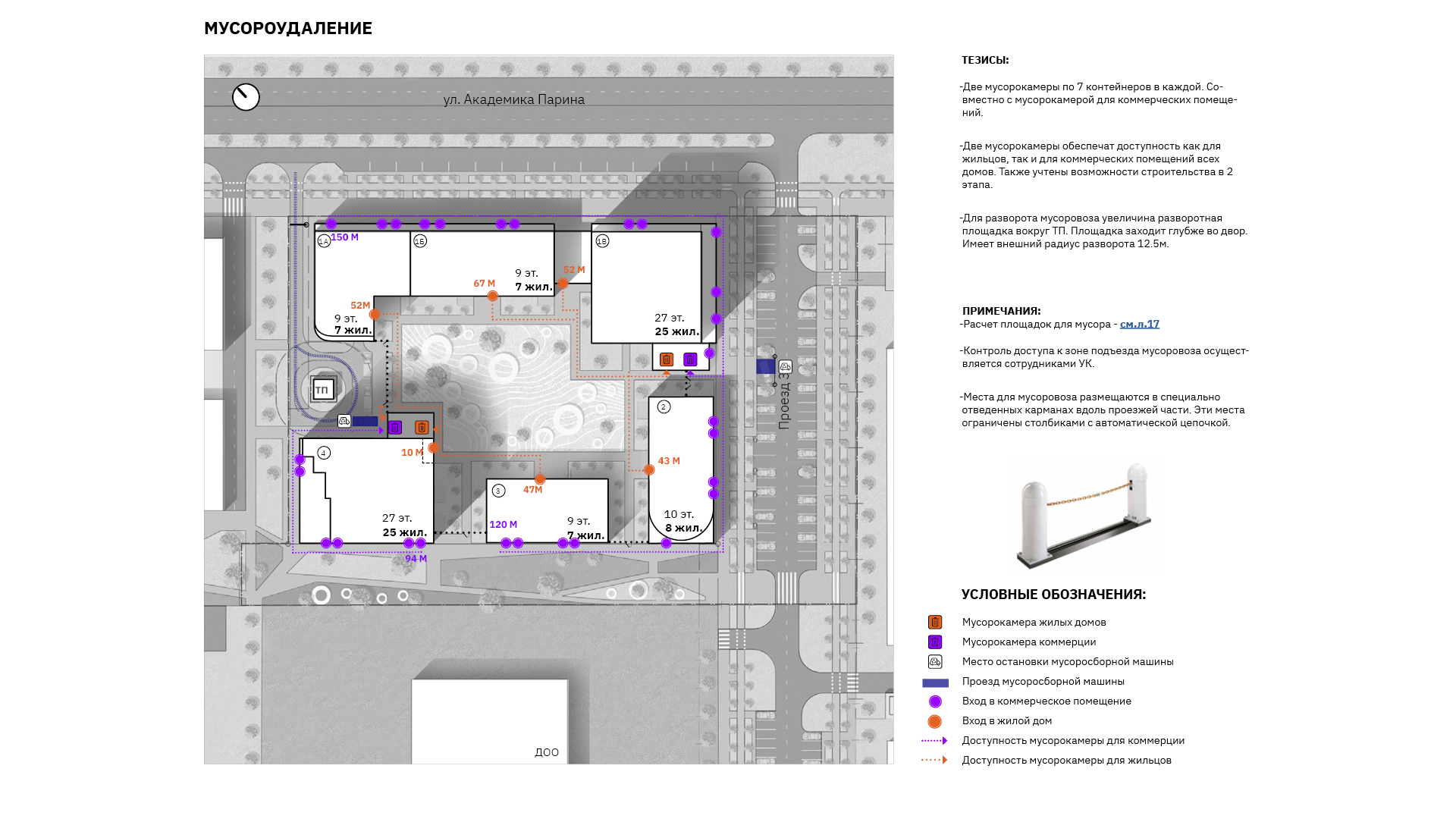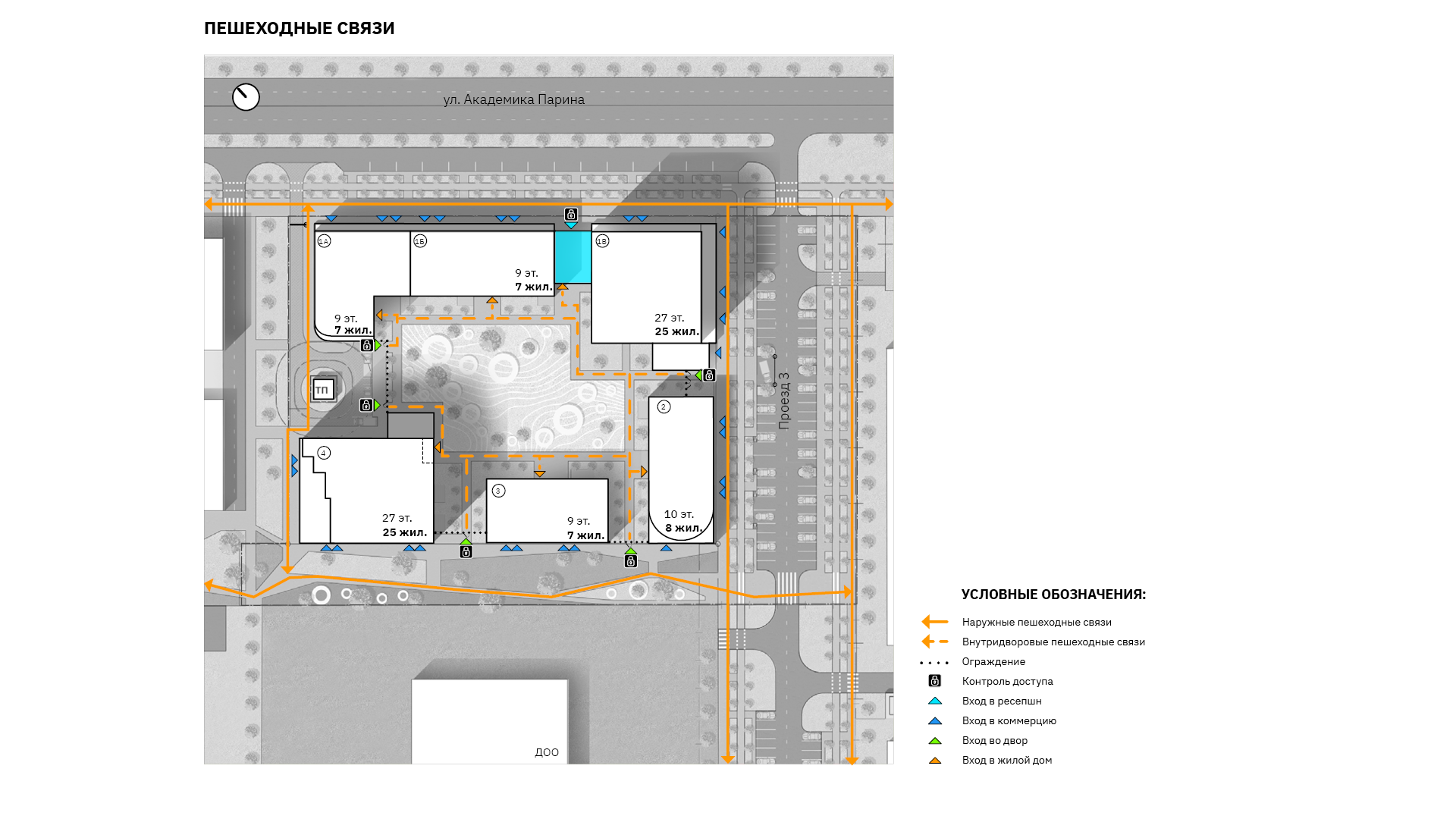 - Во дворе нет автостоянок – оставить машину можно в паркинге по соседству или на внешних улицах. Нет и рассредоточенных по двору функций загрузки и мусороудаления: все служебные функции локализованы в специальном хозяйственном узле, организованном вокруг трансформаторной подстанции.