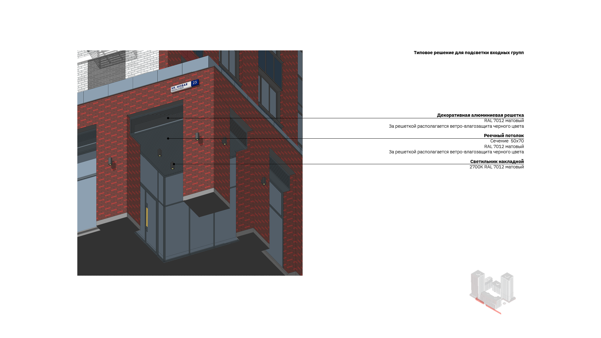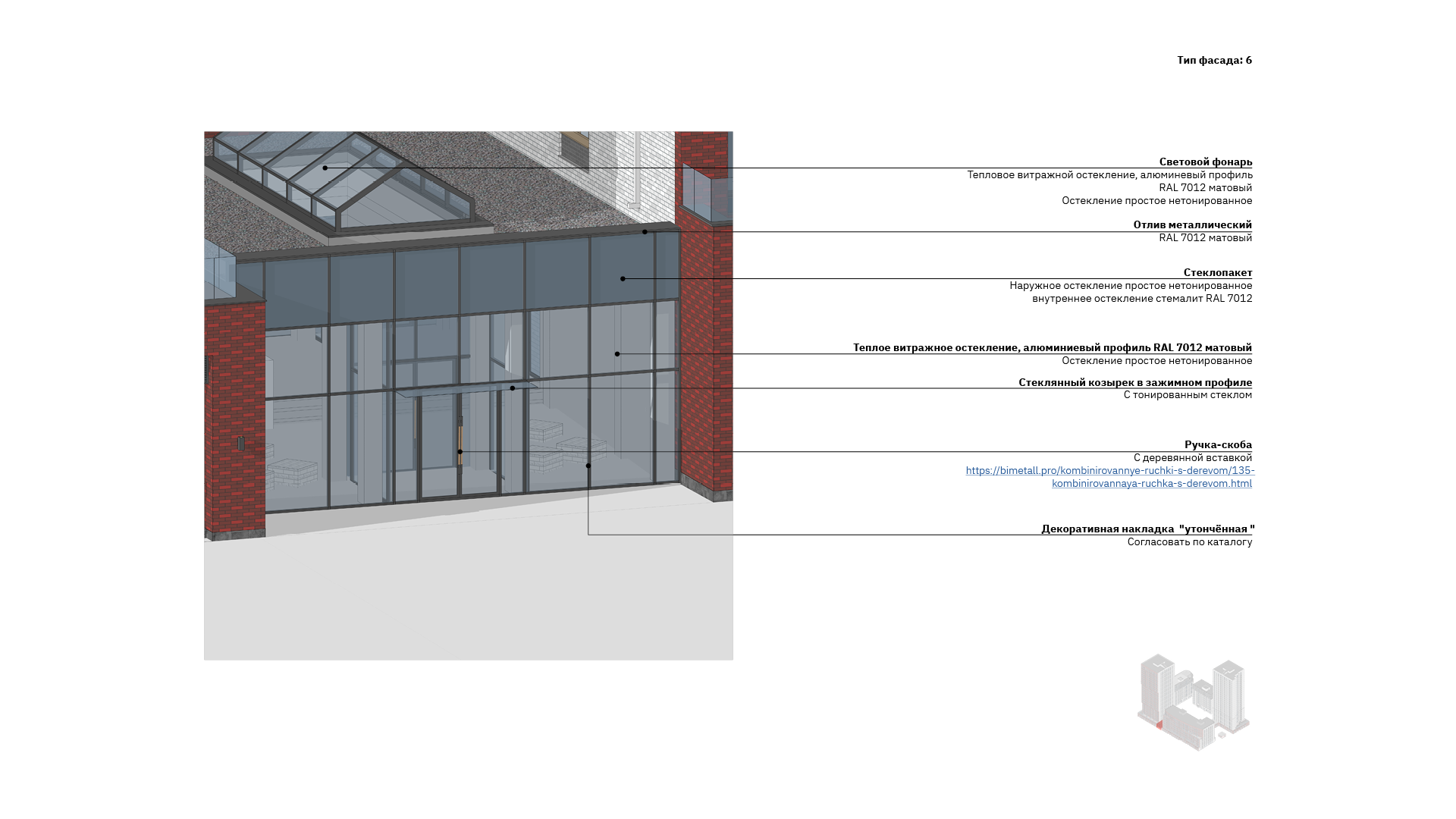 Первые коммерческие этажи вынесены вперед, а возвышающиеся над ними здания – наоборот, уведены вглубь, за счет чего архитектура воспринимается как сомасштабная человеку. Коммерческий фронт отмечен крупноформатными витражами, которые делают стену визуально более проницаемой и обеспечивают связь между улицами и интерьерами помещений.