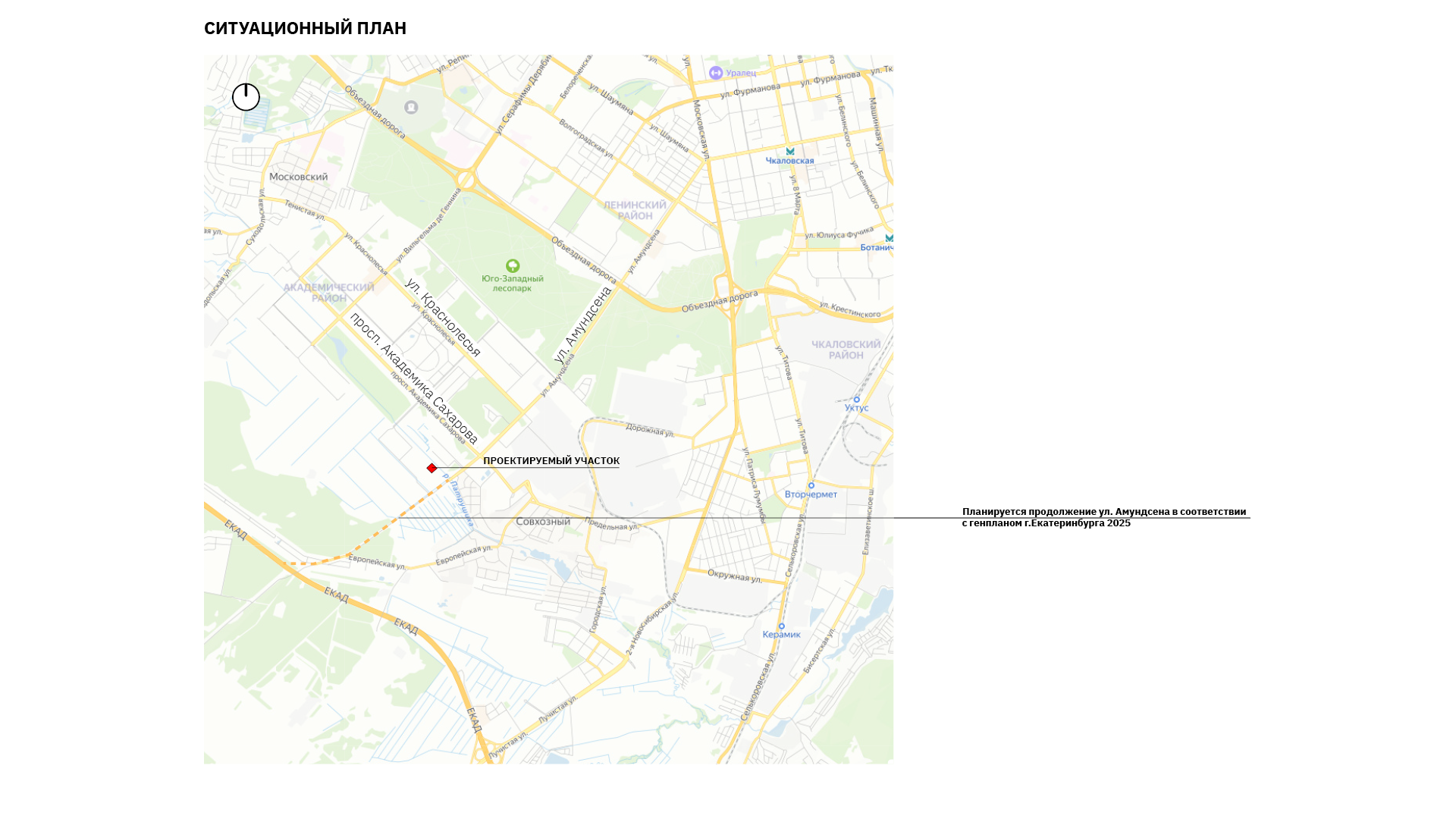 Квартал входит в новый район Екатеринбурга Академический и парадной стороной обращен на ул. Парина – одну из районных магистралей. Более того, магистраль проходит вдоль реки Патрушихи, и основной фасад просматривается с действительного большого расстояния – через реку и широкую проезжую часть. Остальные части обращены внутрь микрорайона – на многоуровневый паркинг, торговый центр и детский сад.