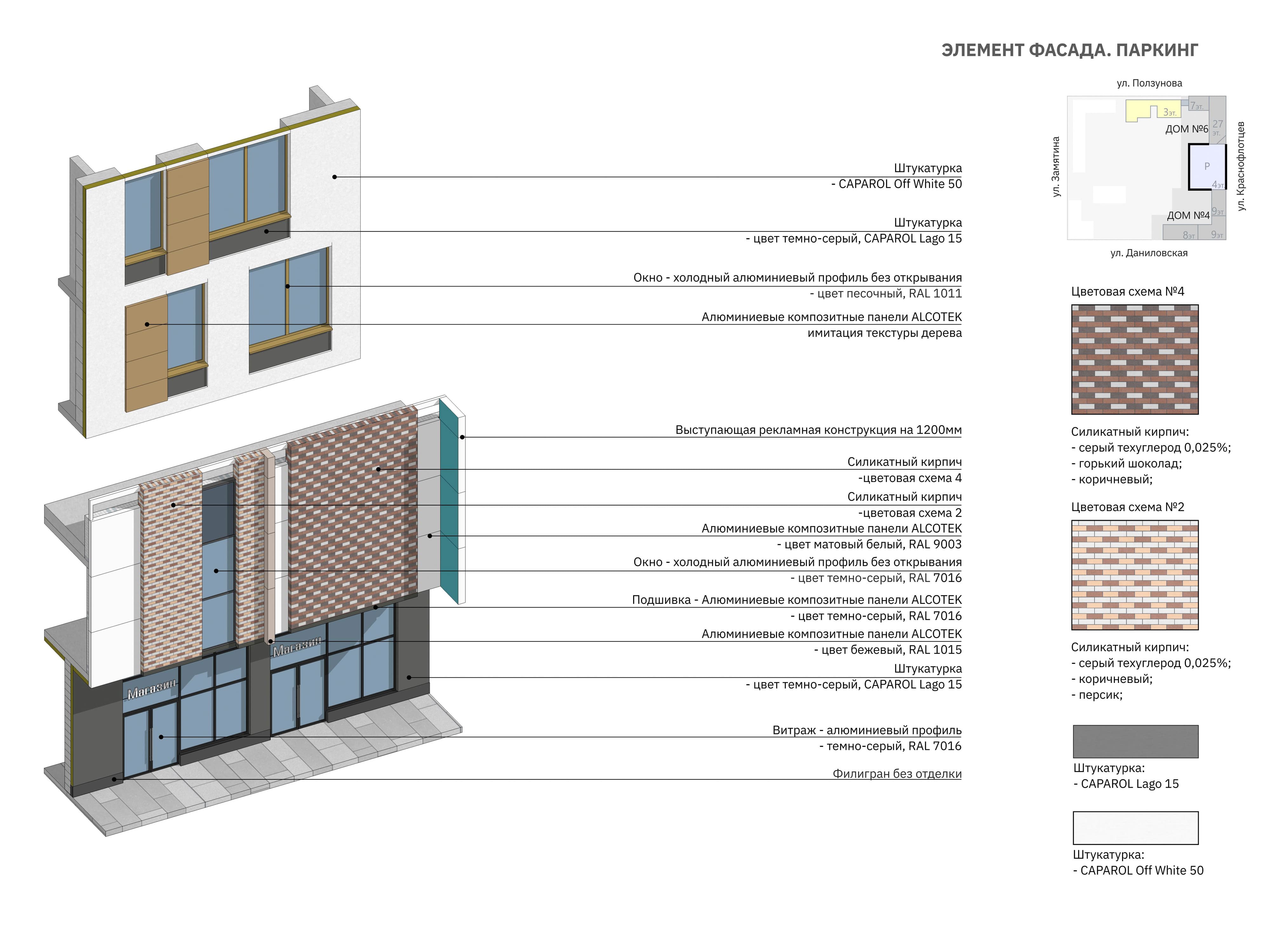 секции базовой этажности, в том числе и паркинг, решены по-разному: отделка кирпичом