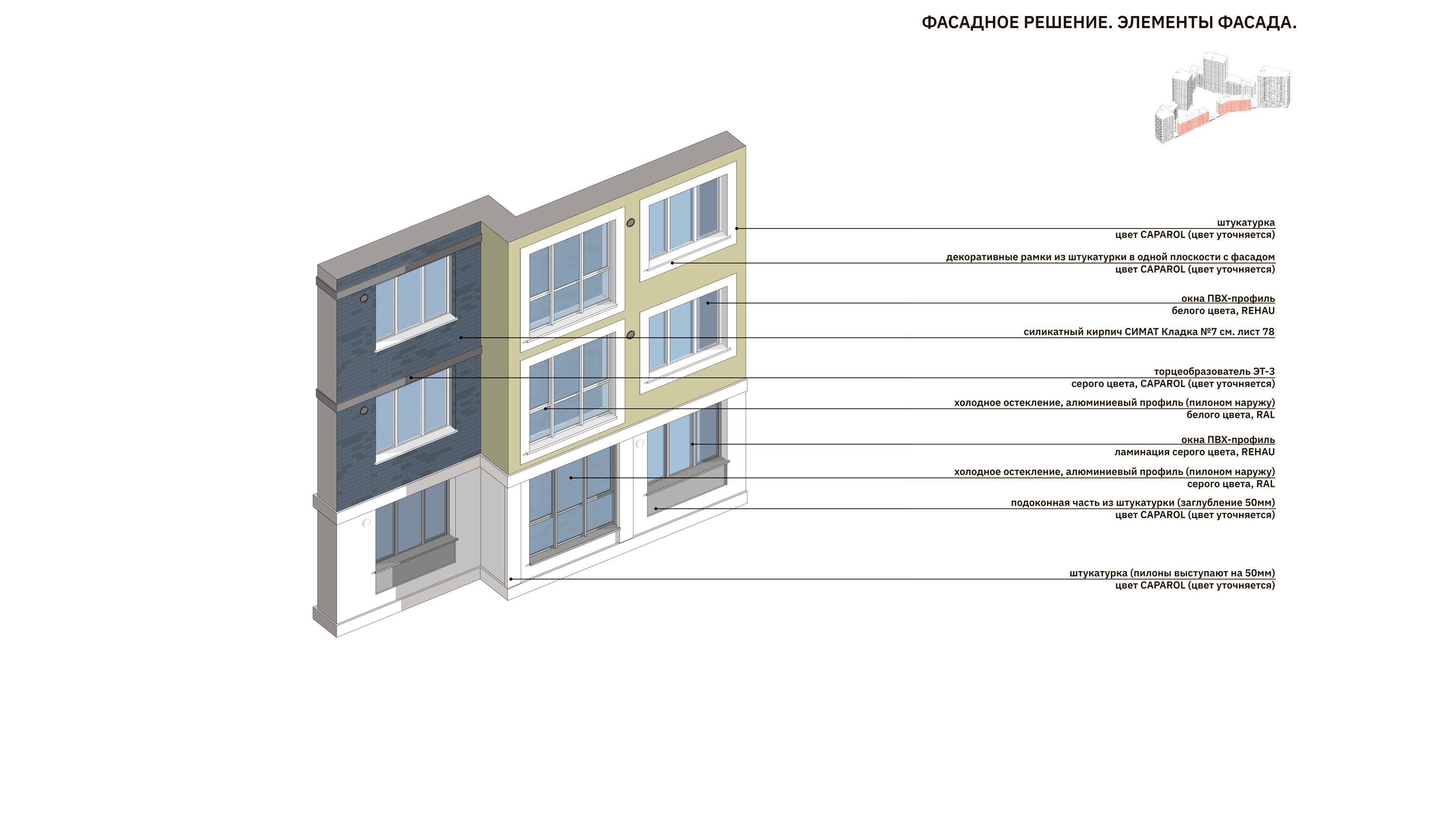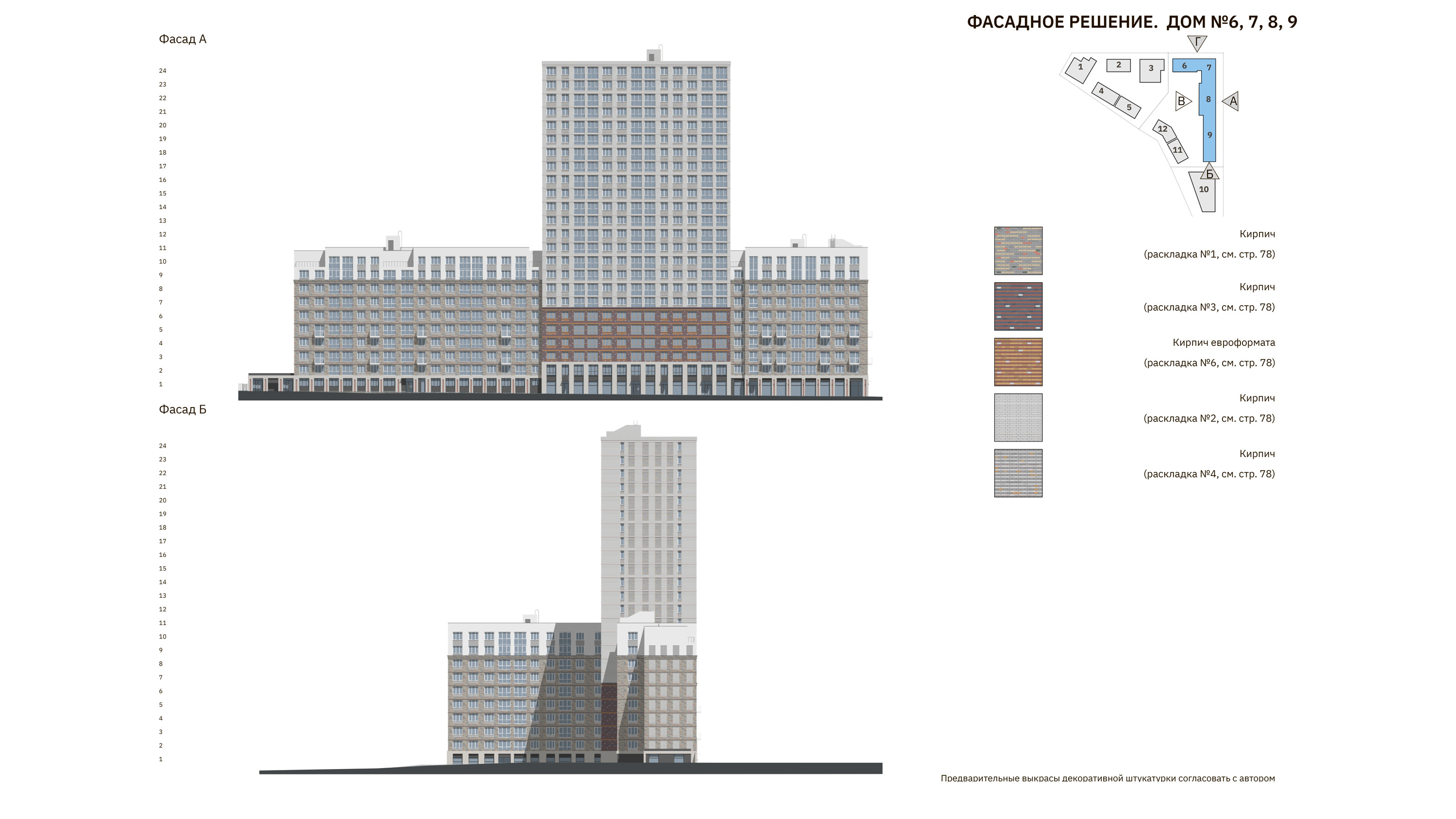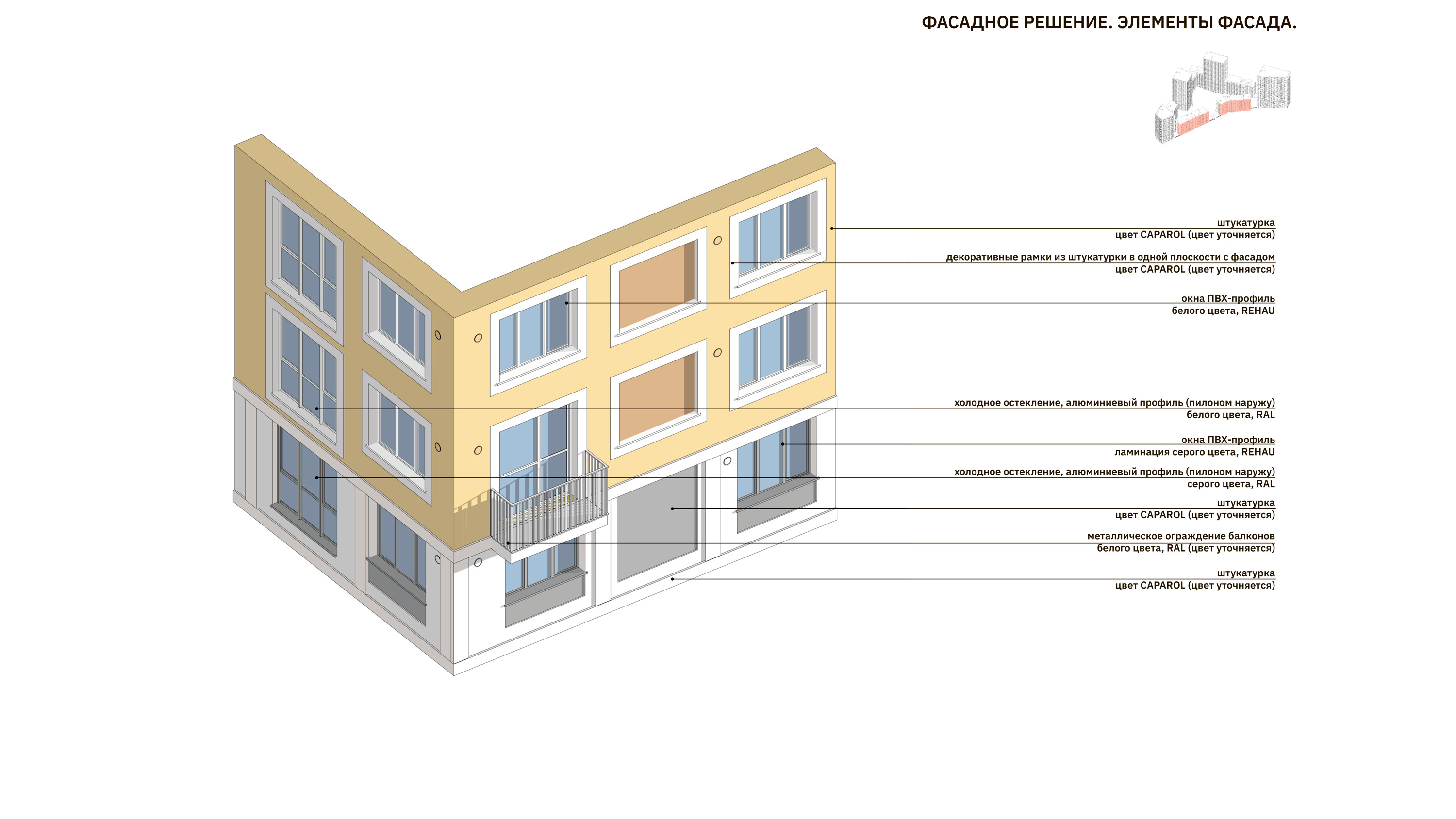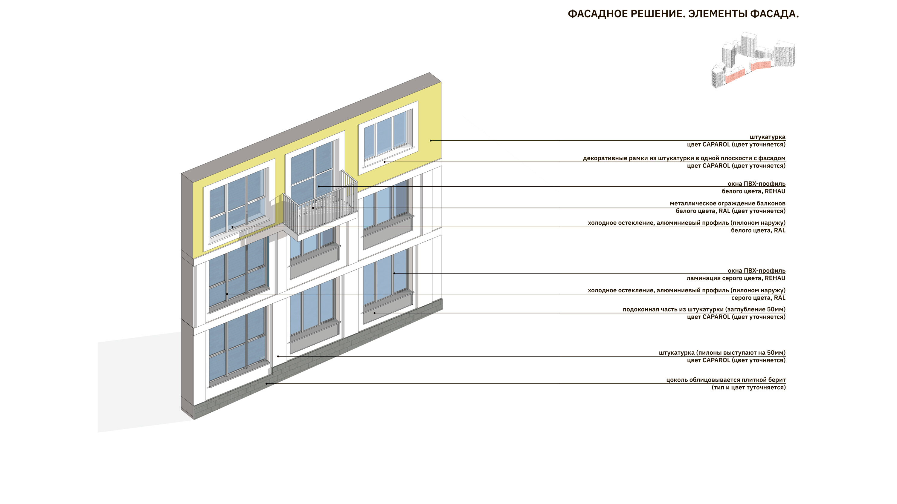 Архитектура фасадов предполагает акцентное выделение базовой этажности, все объемы
