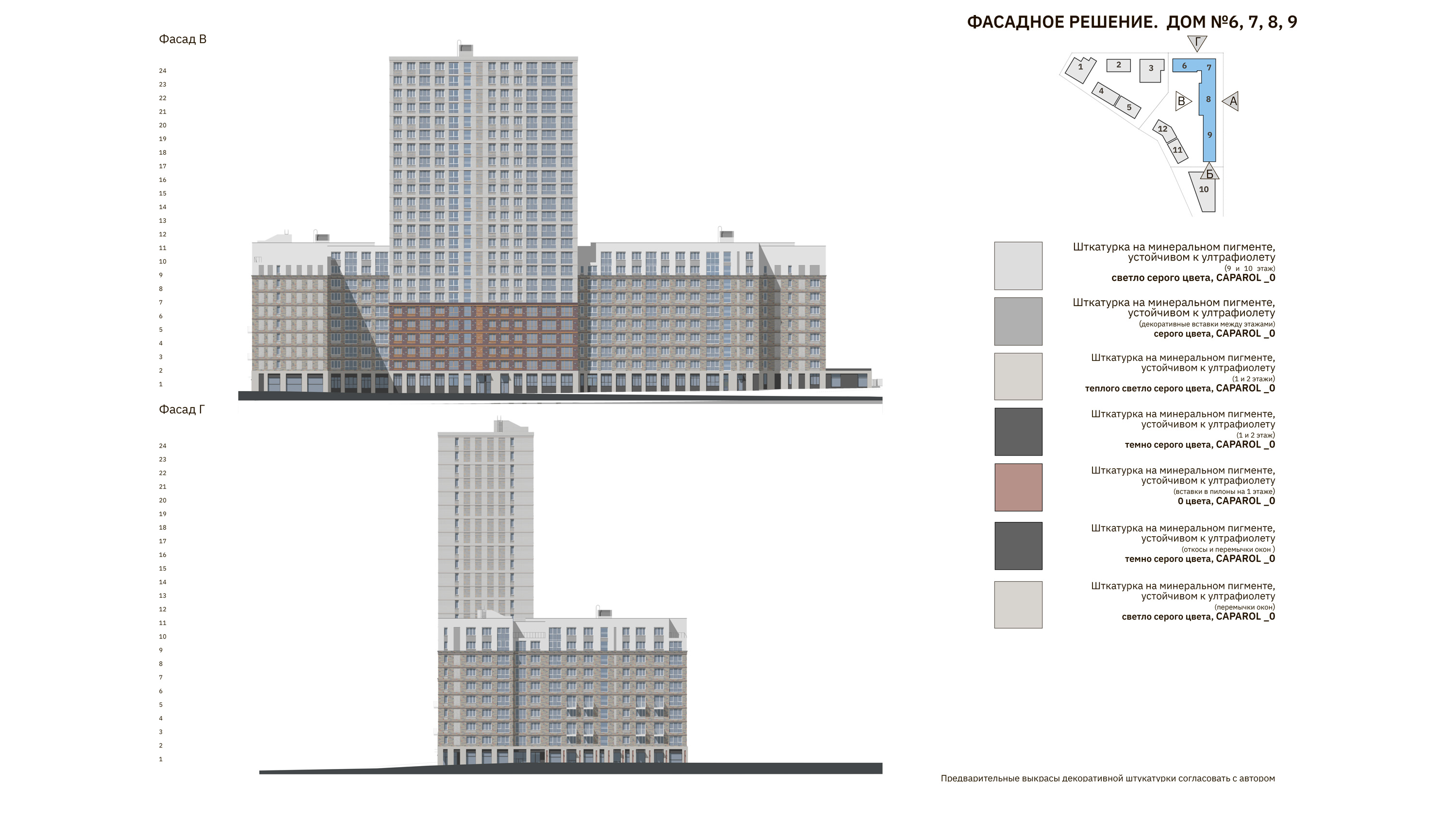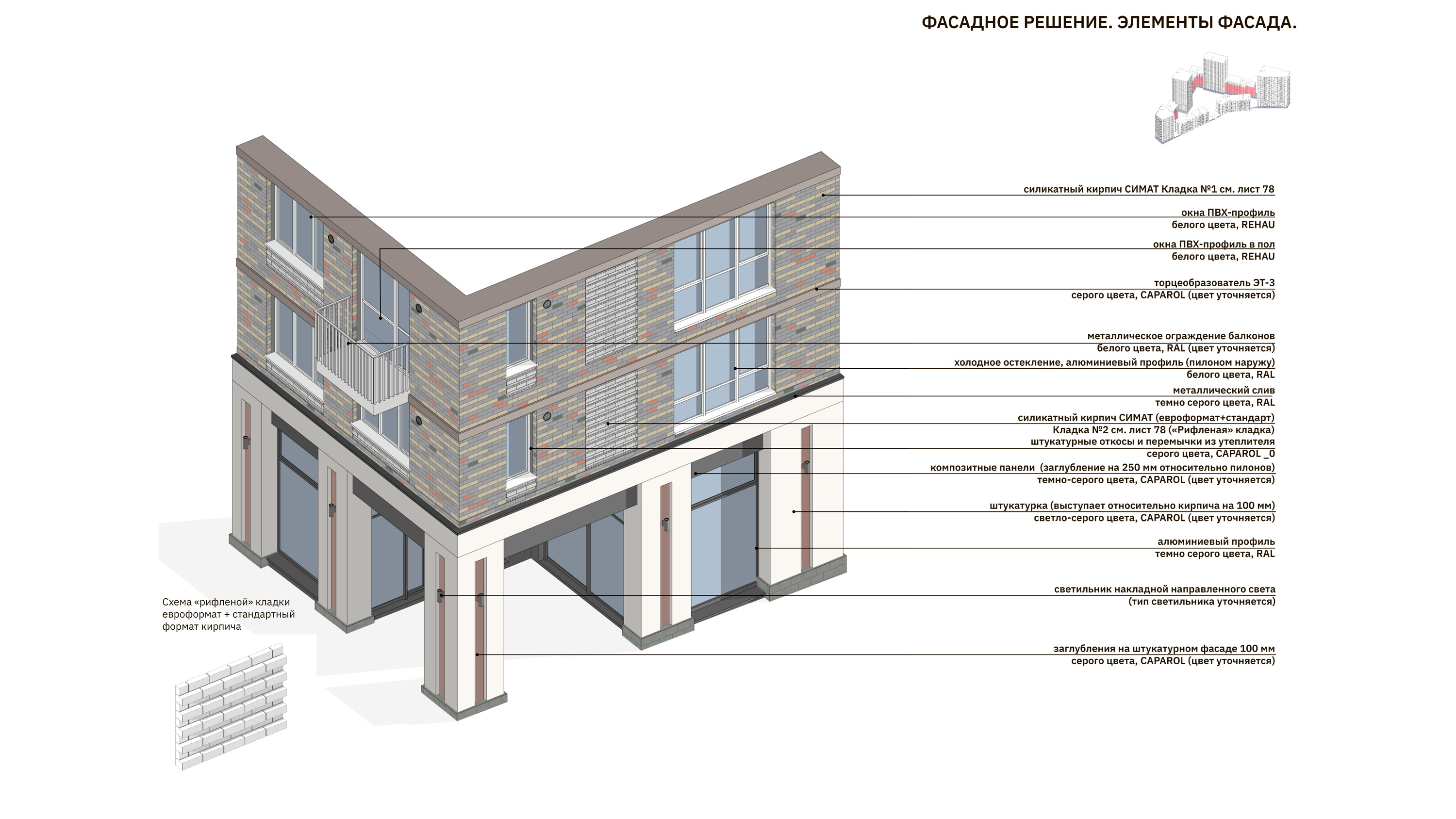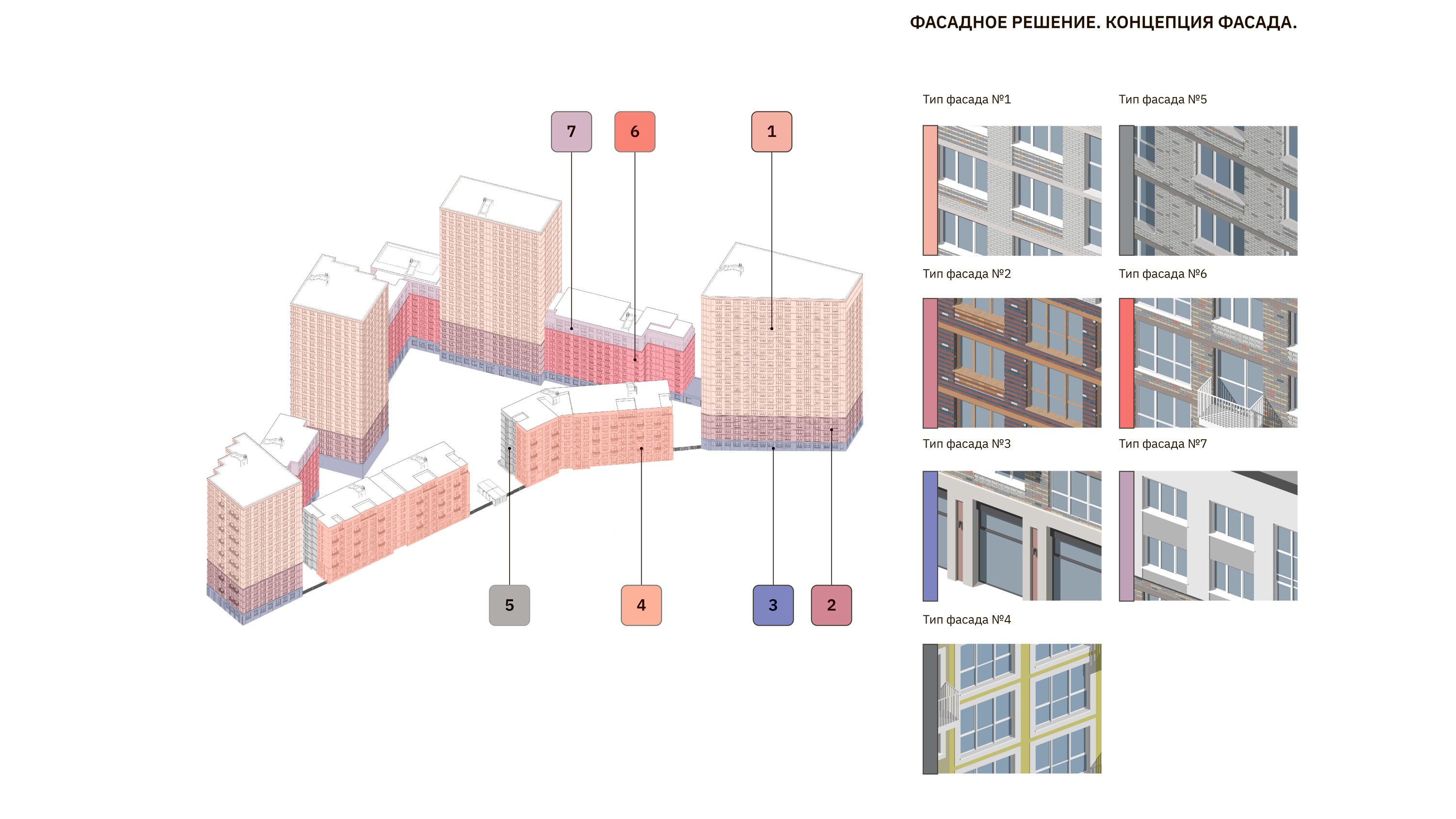 Архитектура фасадов предполагает акцентное выделение базовой этажности, все объемы