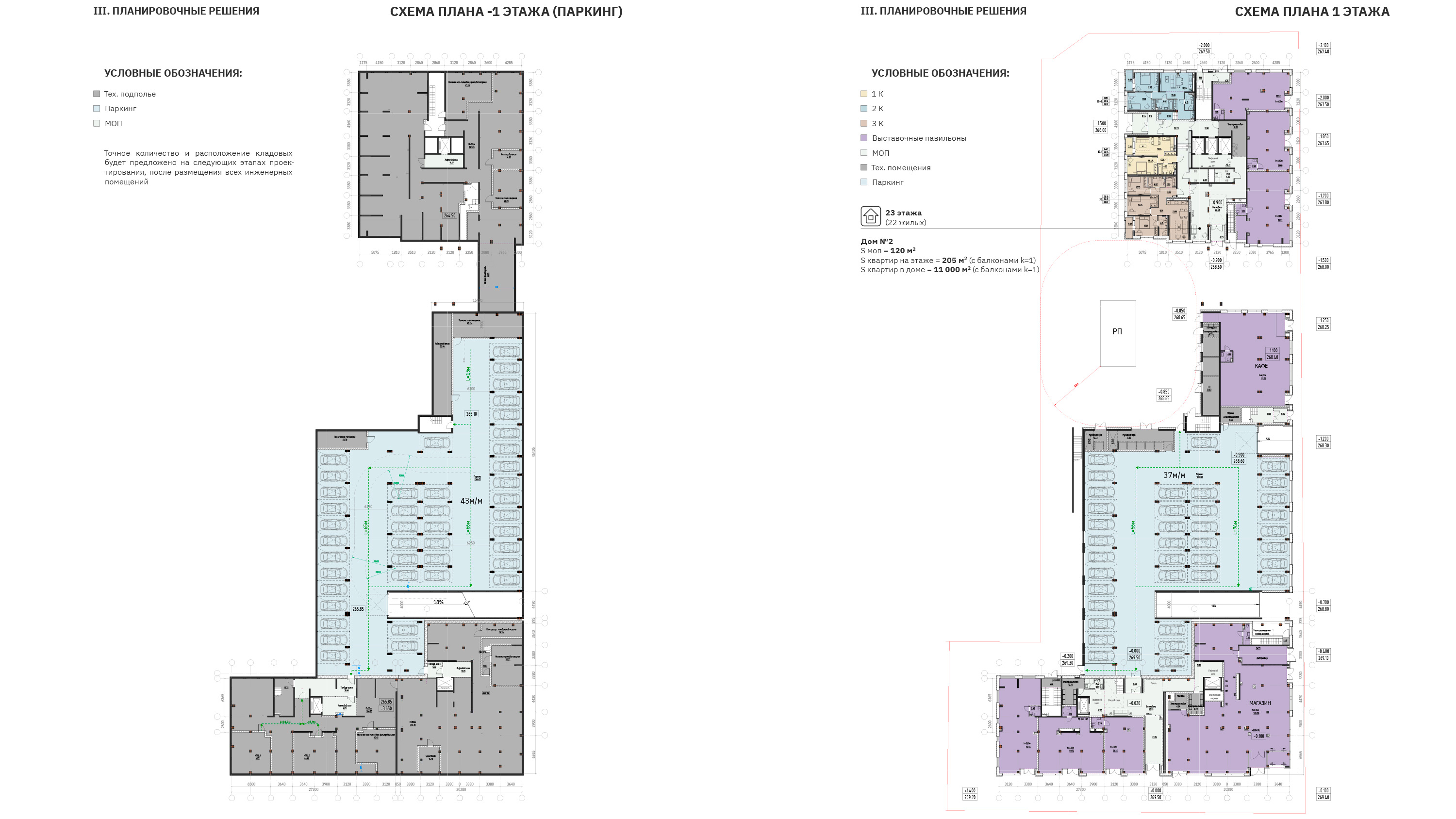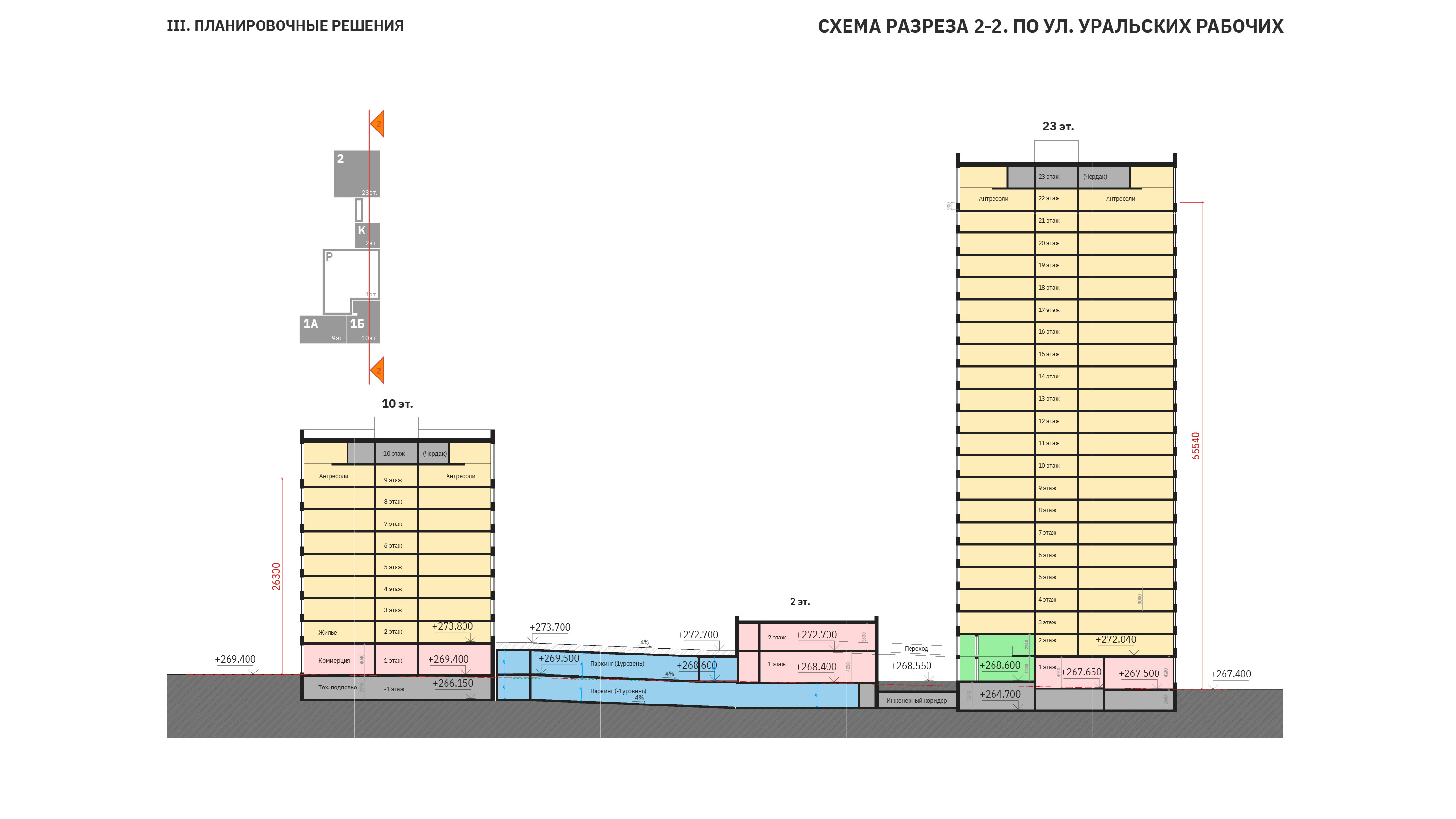 - подземный уровень – большой паркинг, в котором расположены хозяйственные функции,загрузка, подъезд такси, кладовые жителей, трансформаторная подстанция;