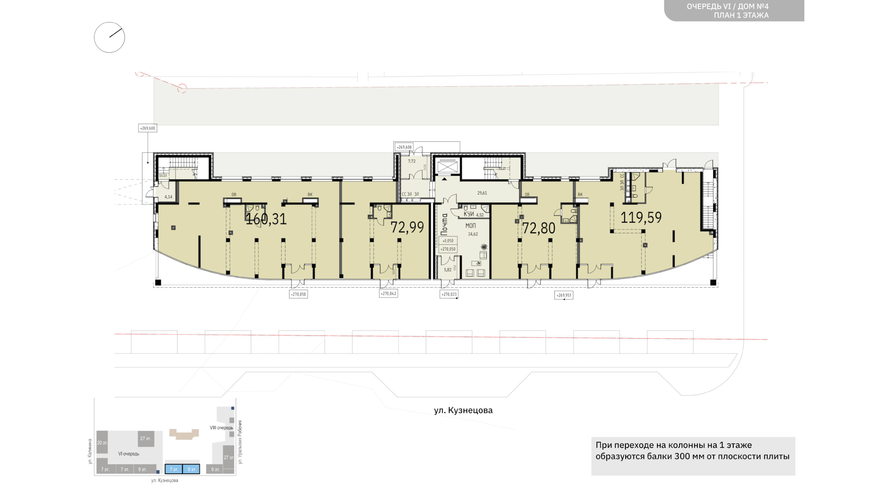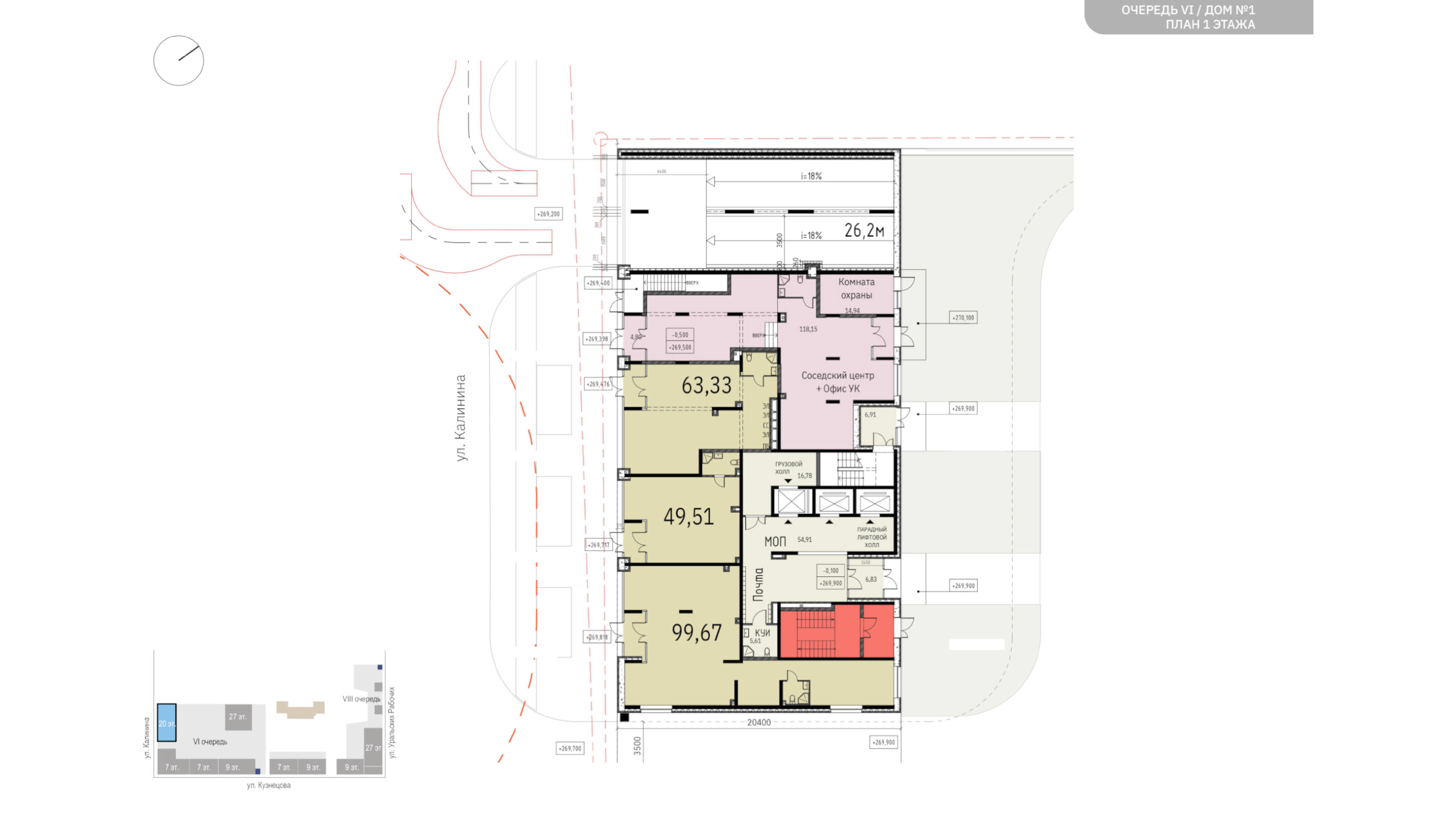 пространства разделены. На улицу выходят два высотных здания: одно из них (20 этажей)