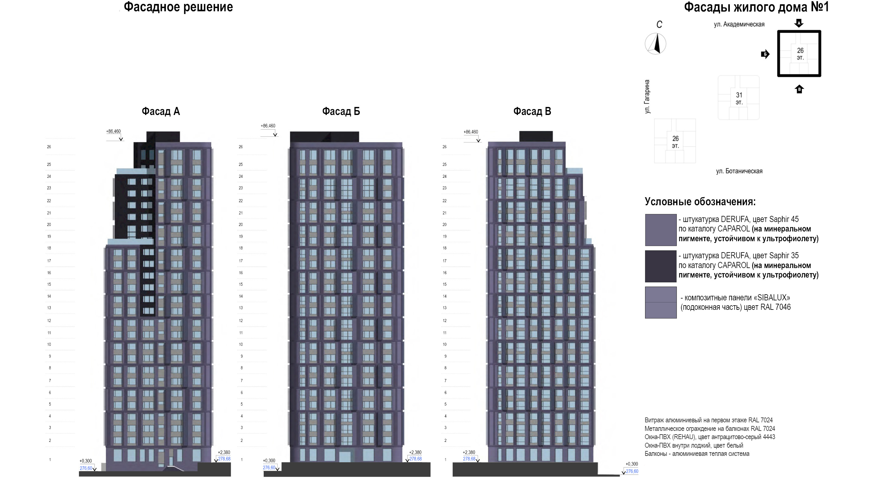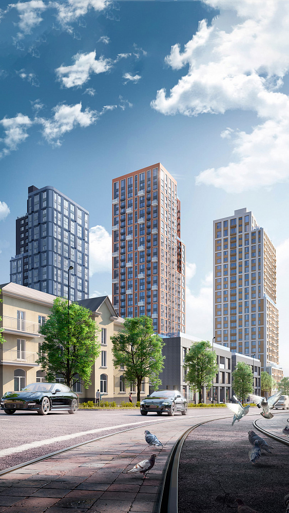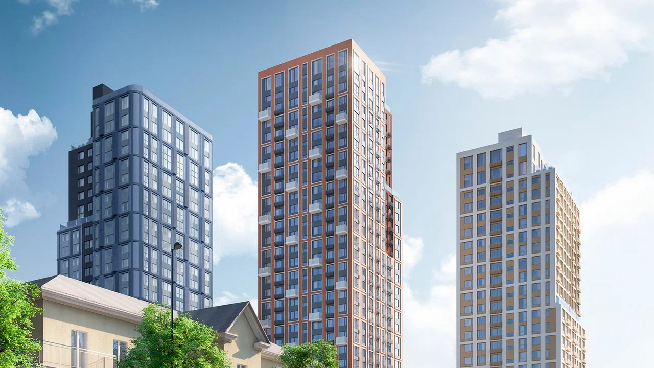 Три жилых здания имеют разную высотность и фасады разных цветов, для создания