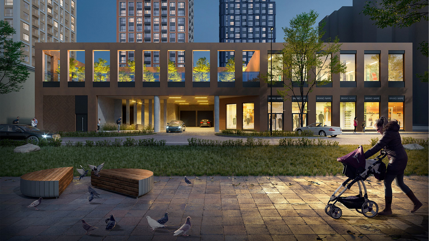 Паркинг находится в стилобате, туда же вынесены все хозяйственные функции –