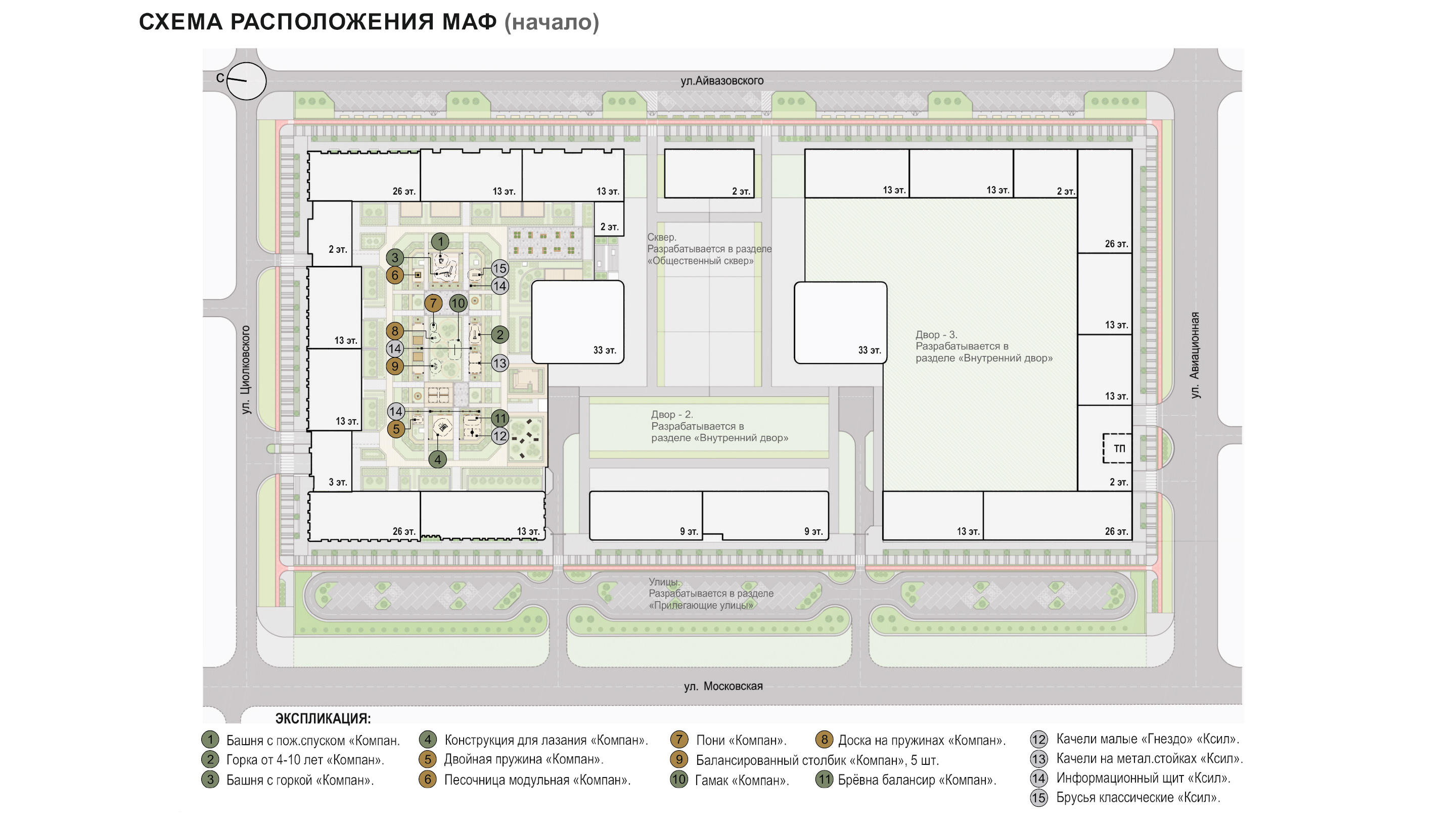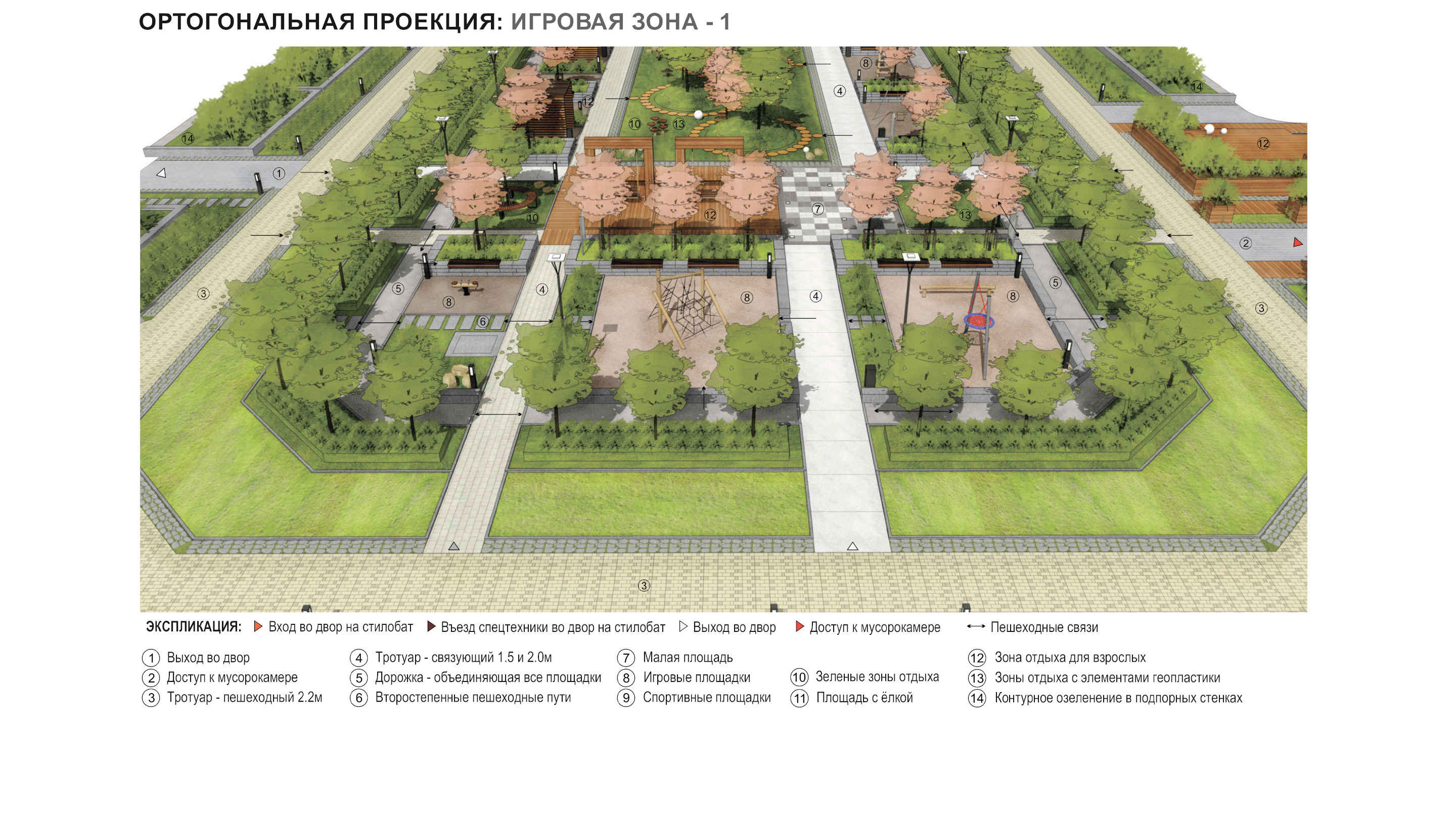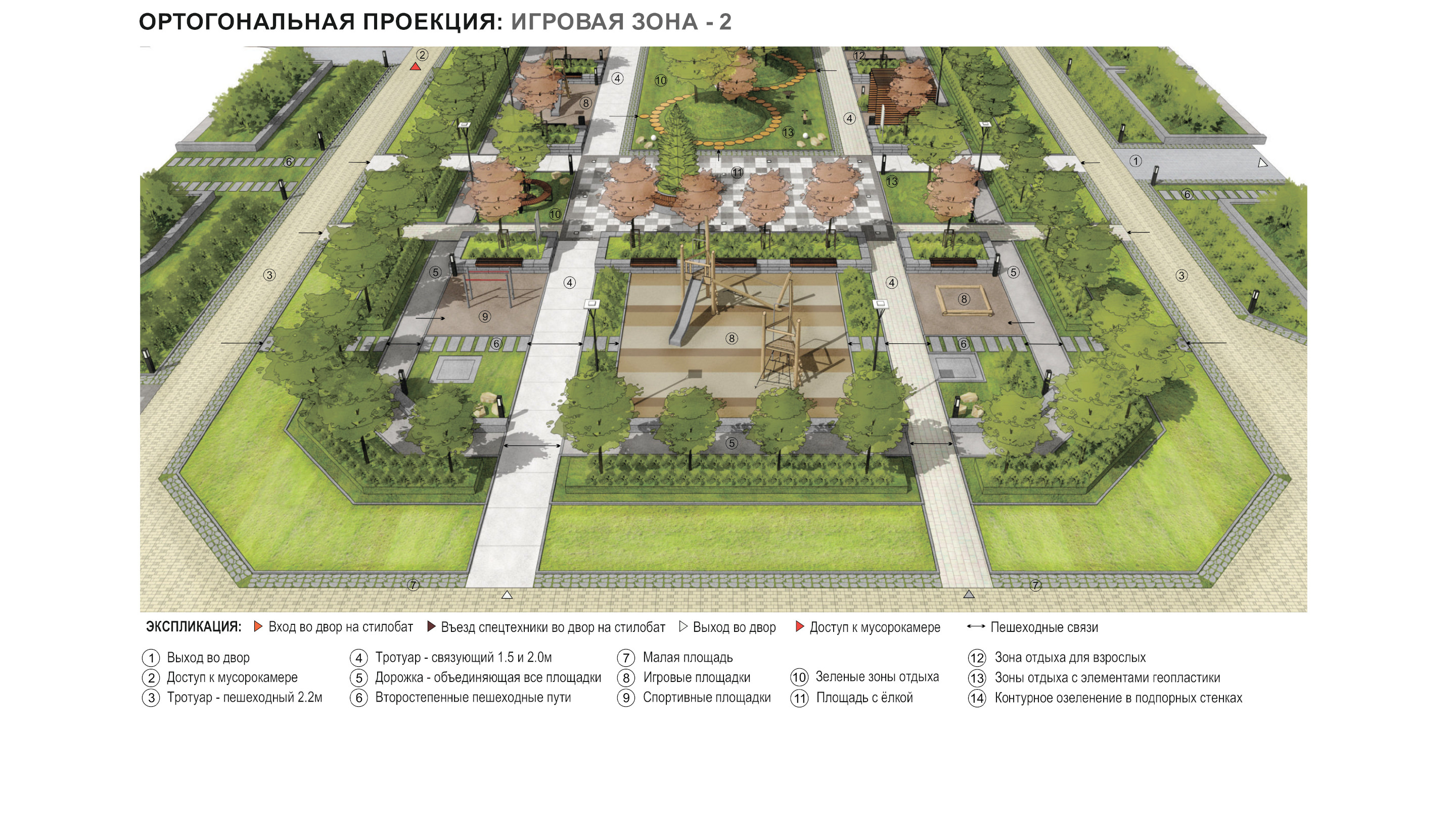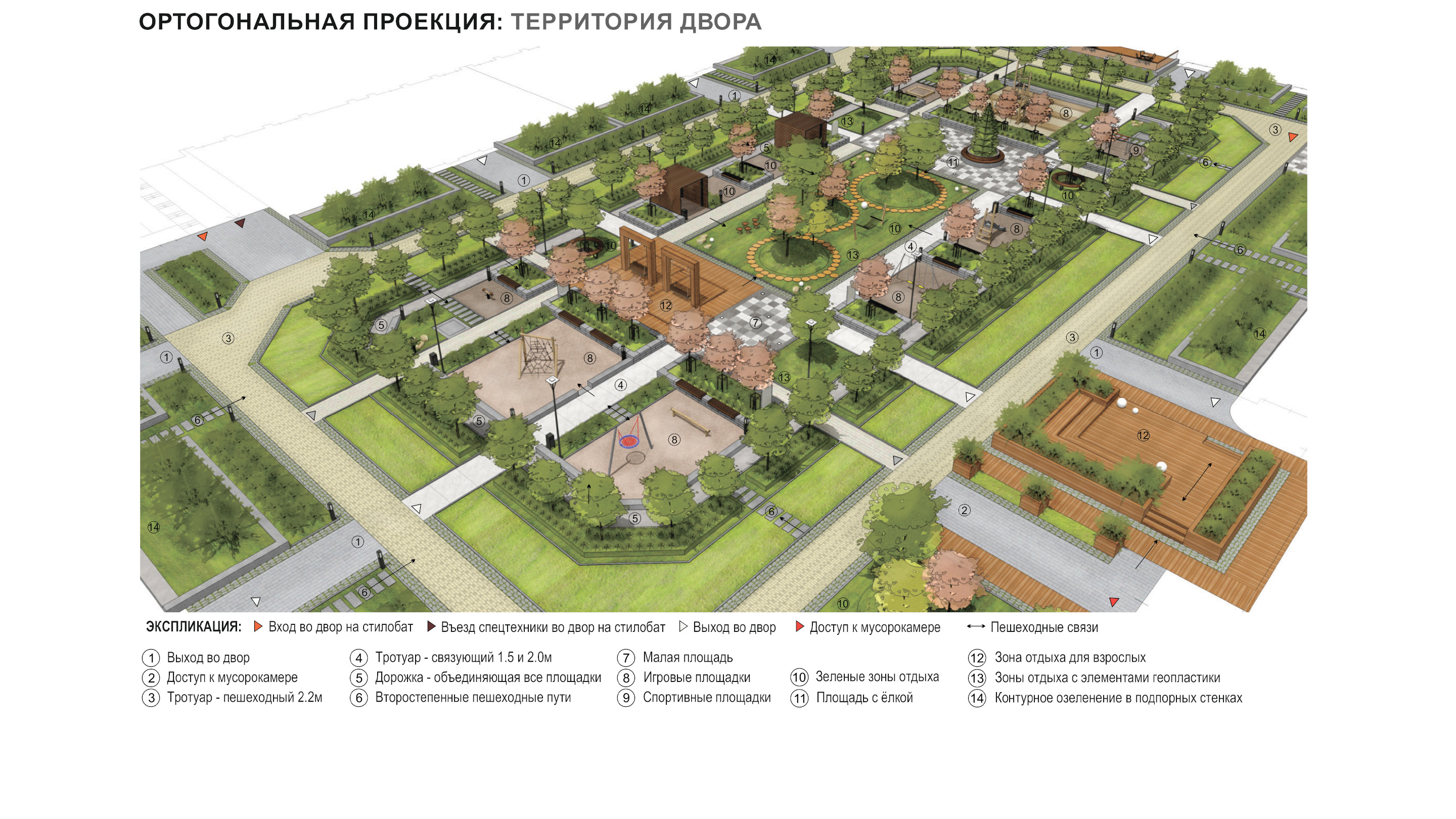 спортивные корты, зеленые зоны отдыха для взрослых. Композиционным центром двора является