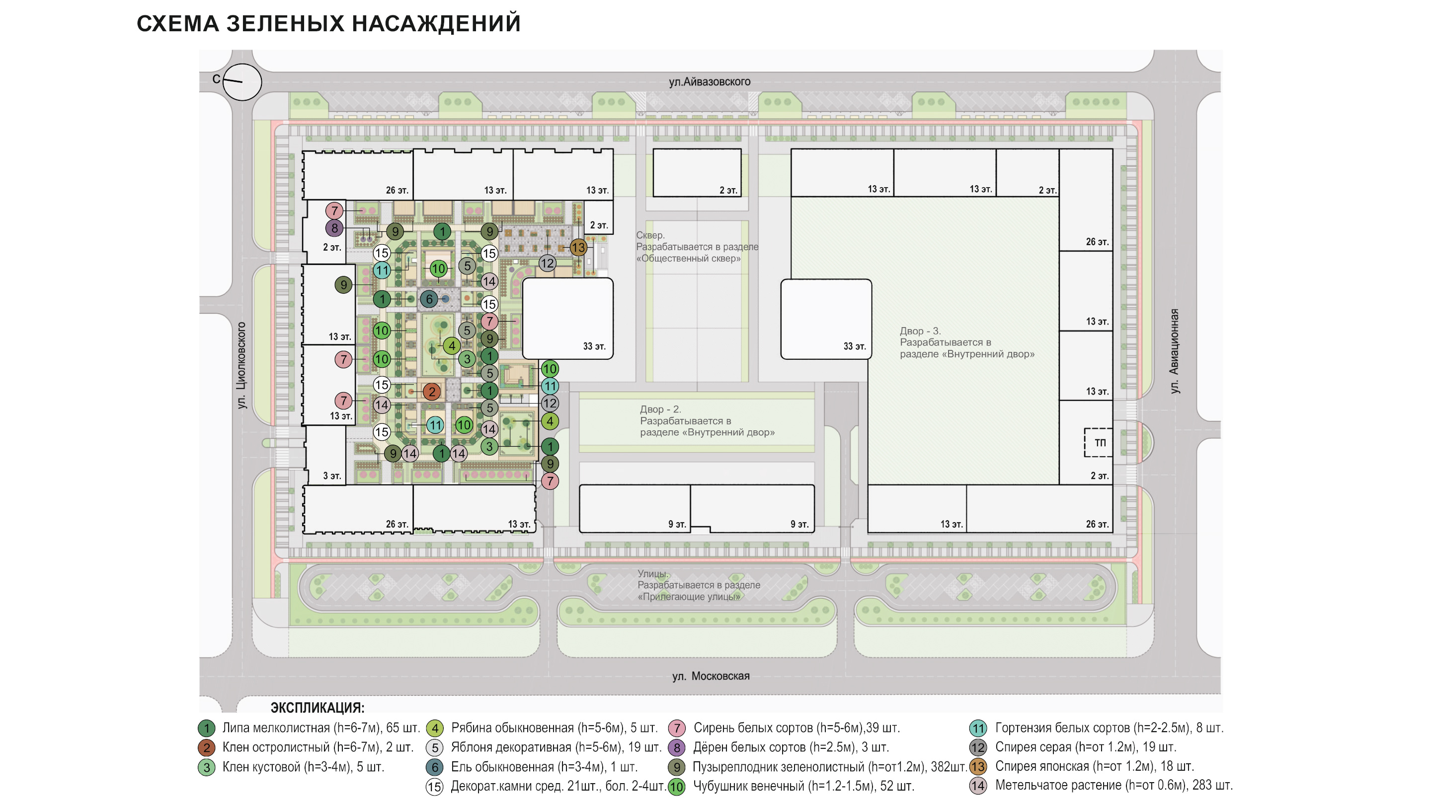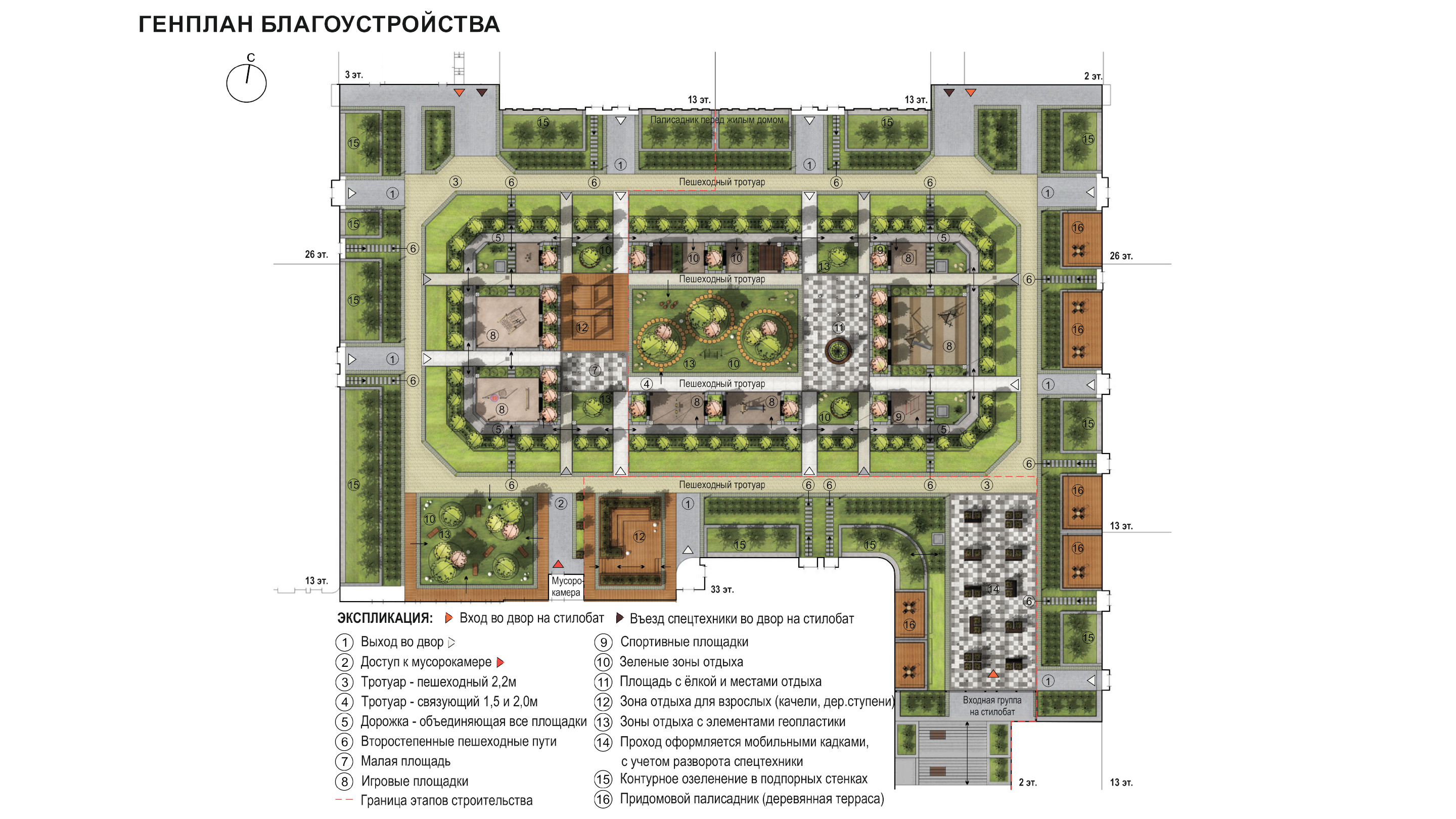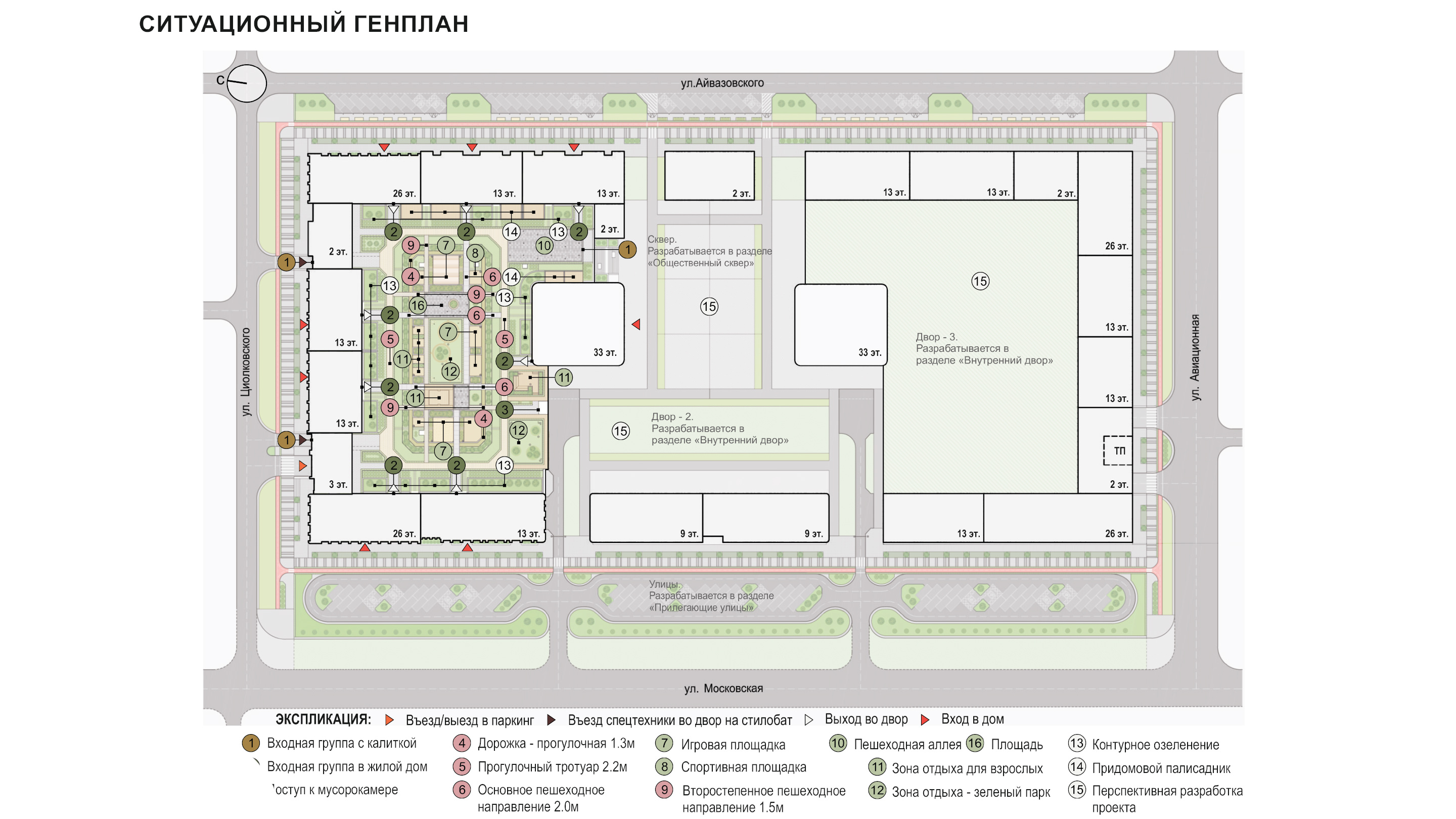 спортивные корты, зеленые зоны отдыха для взрослых. Композиционным центром двора является