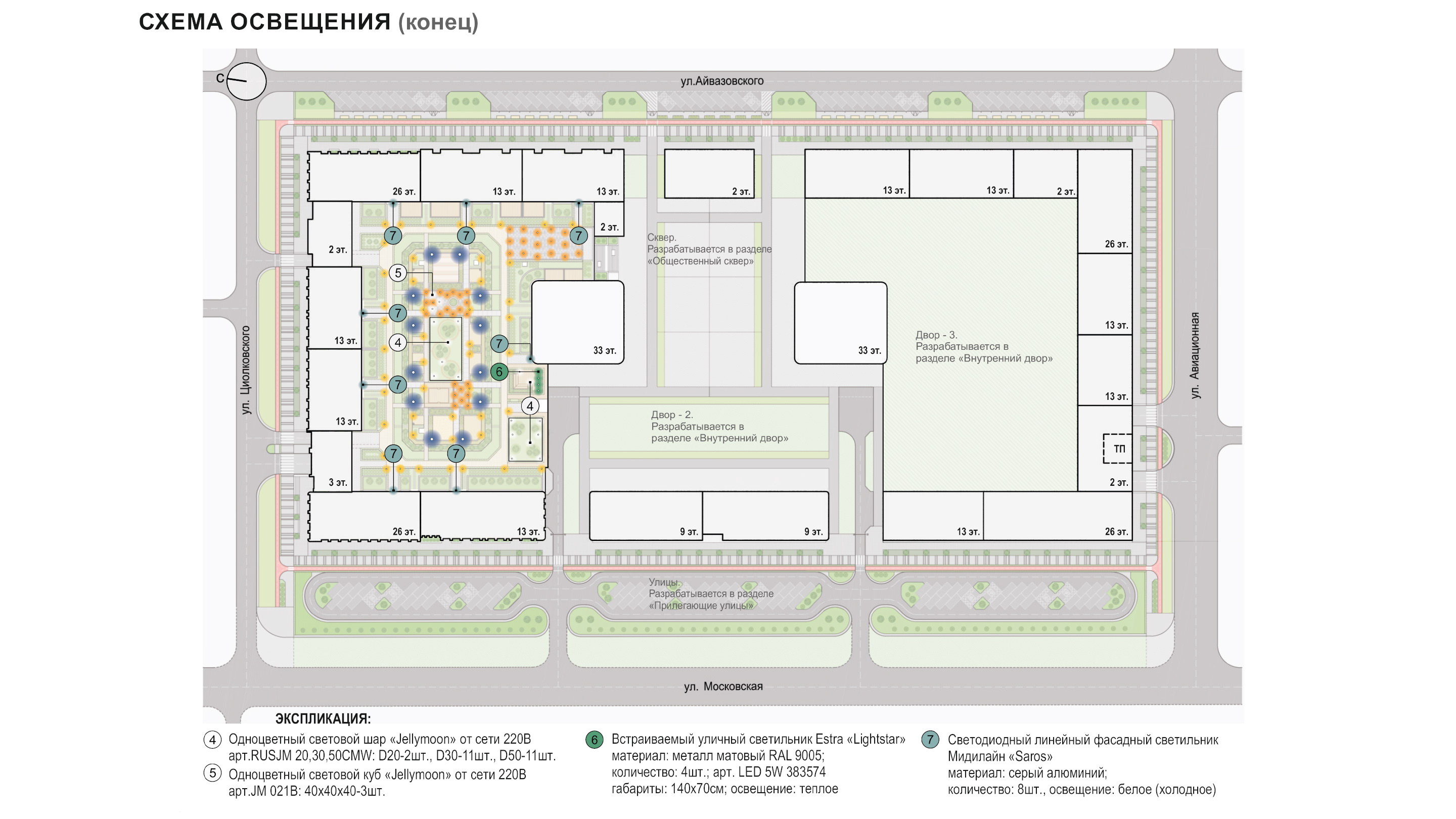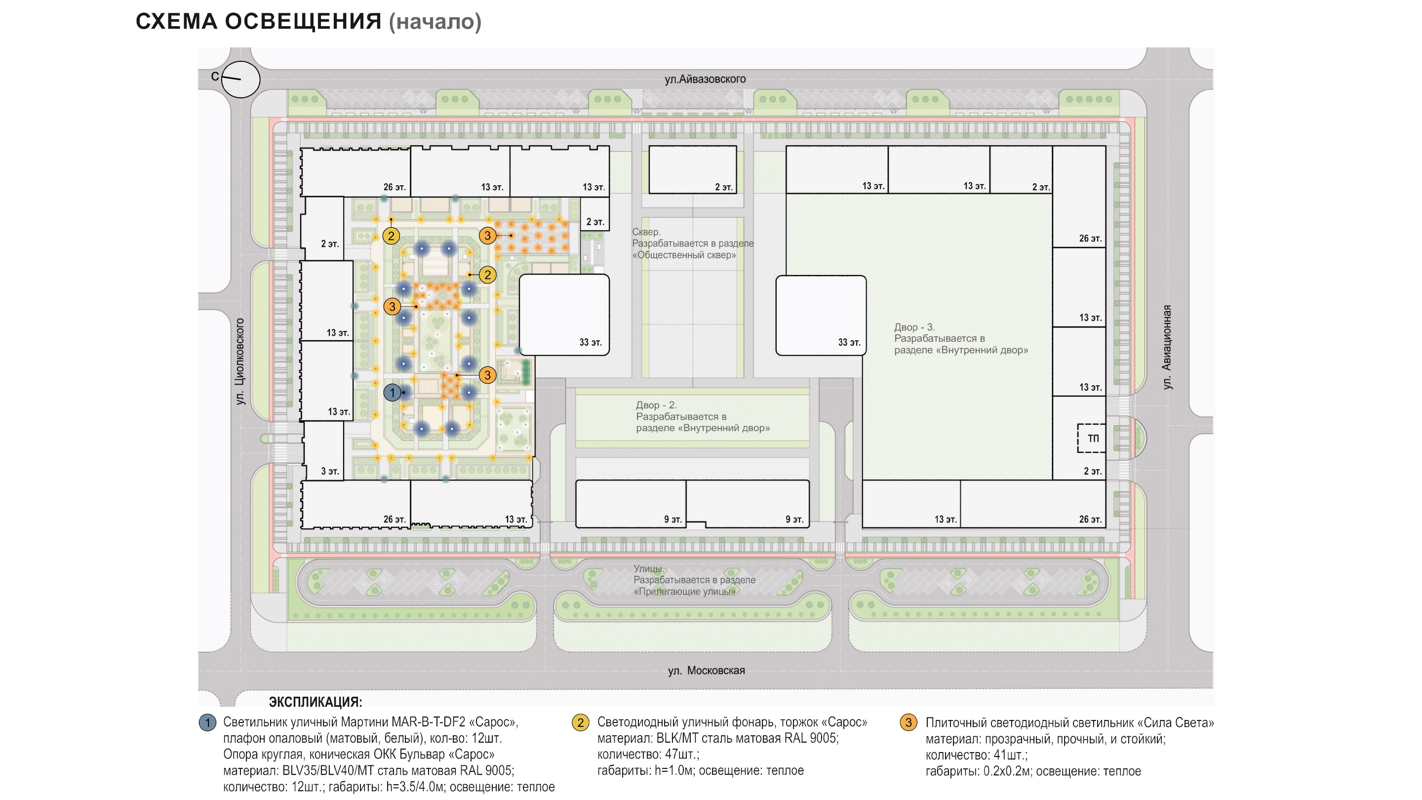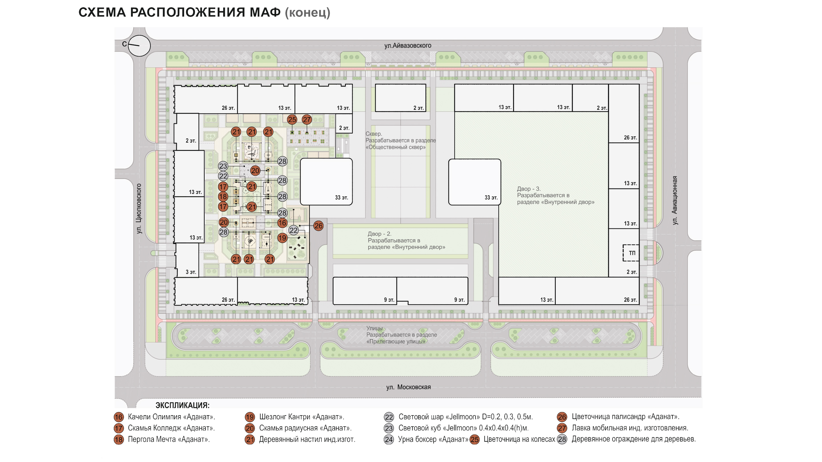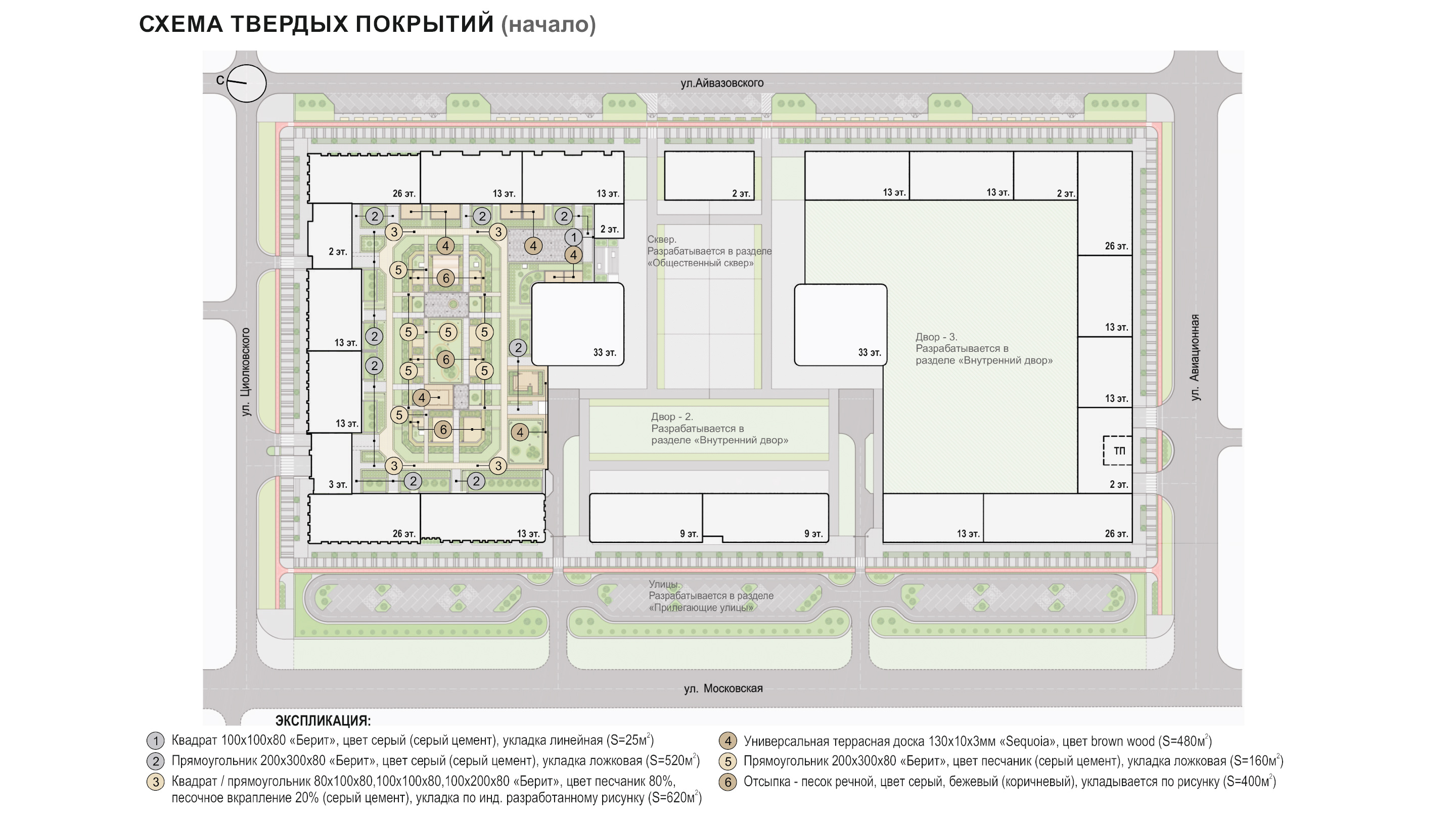 спортивные корты, зеленые зоны отдыха для взрослых. Композиционным центром двора является