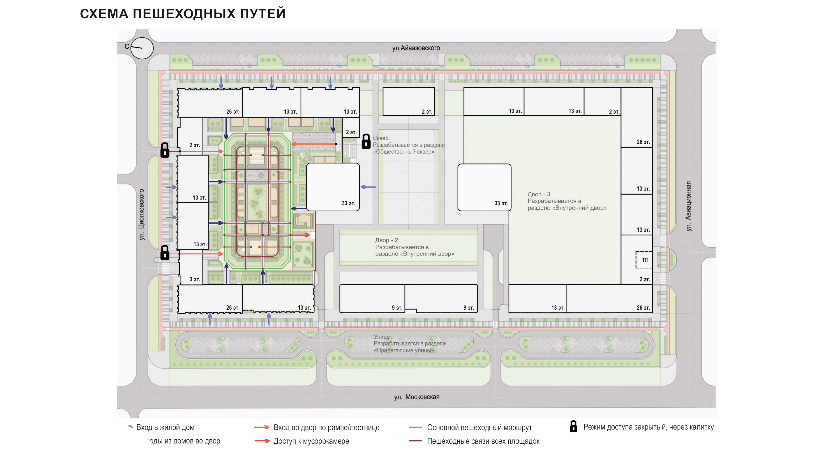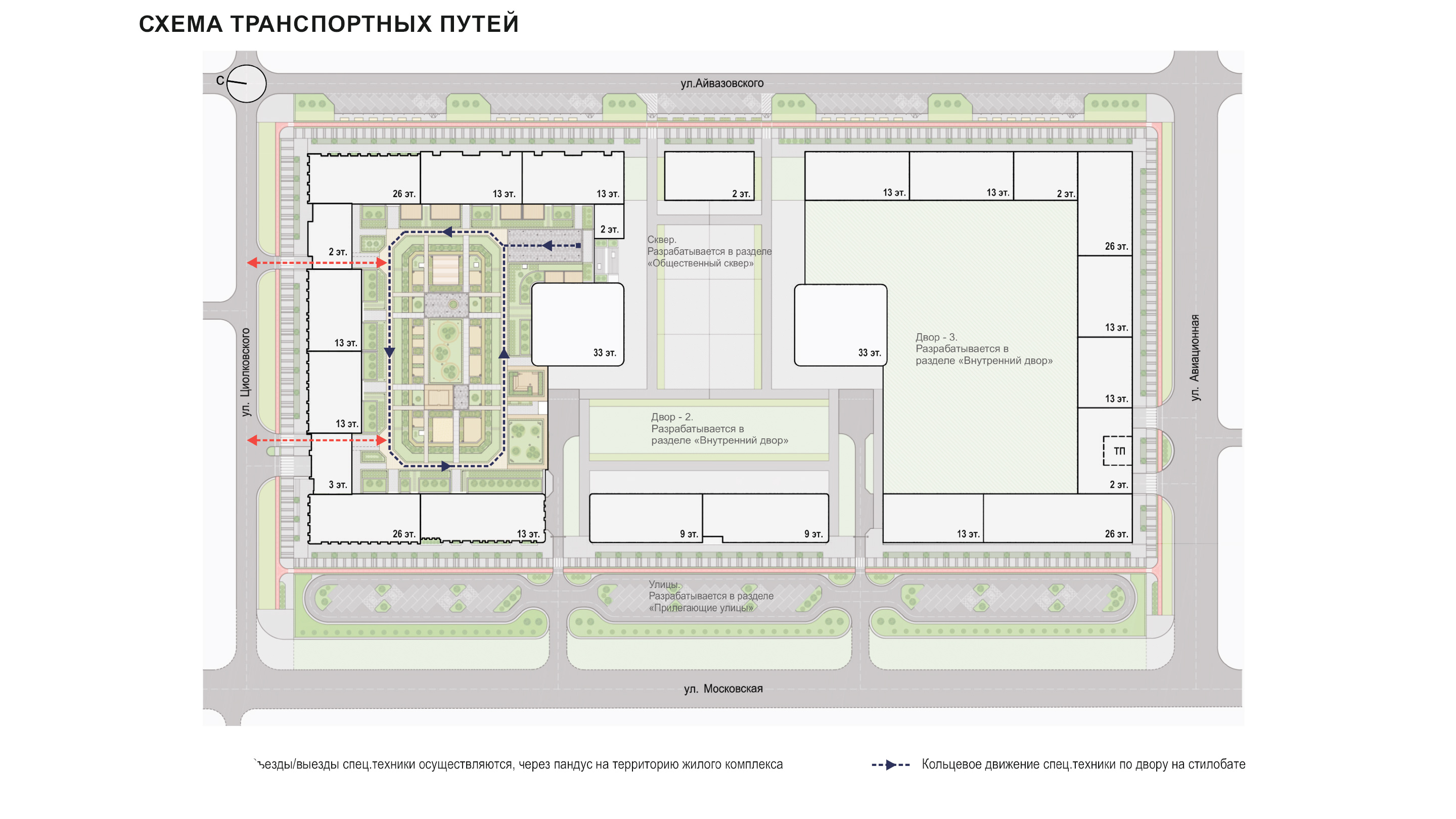 В проекте также предусмотрено разделение потоков в местах заезда в подземный паркинг и