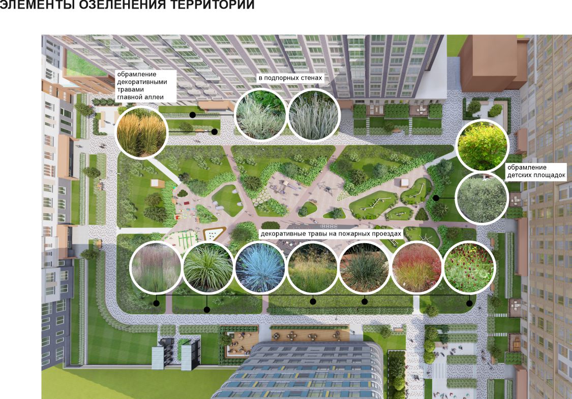 квартирами на первом этаже и двором. Кроме того, в нее включены зоны отдыха со скамейками,