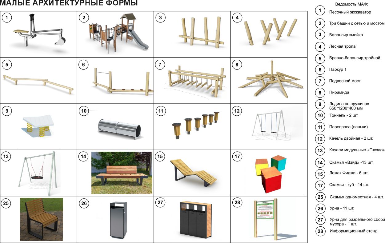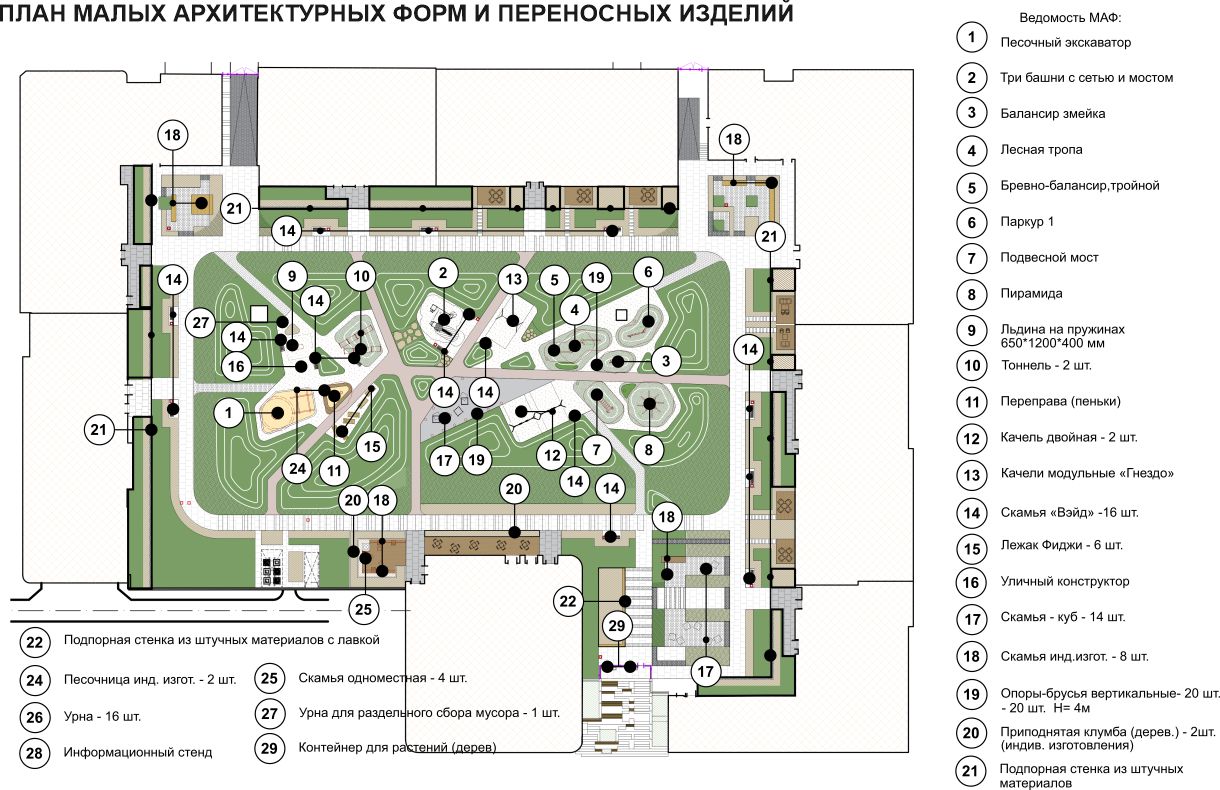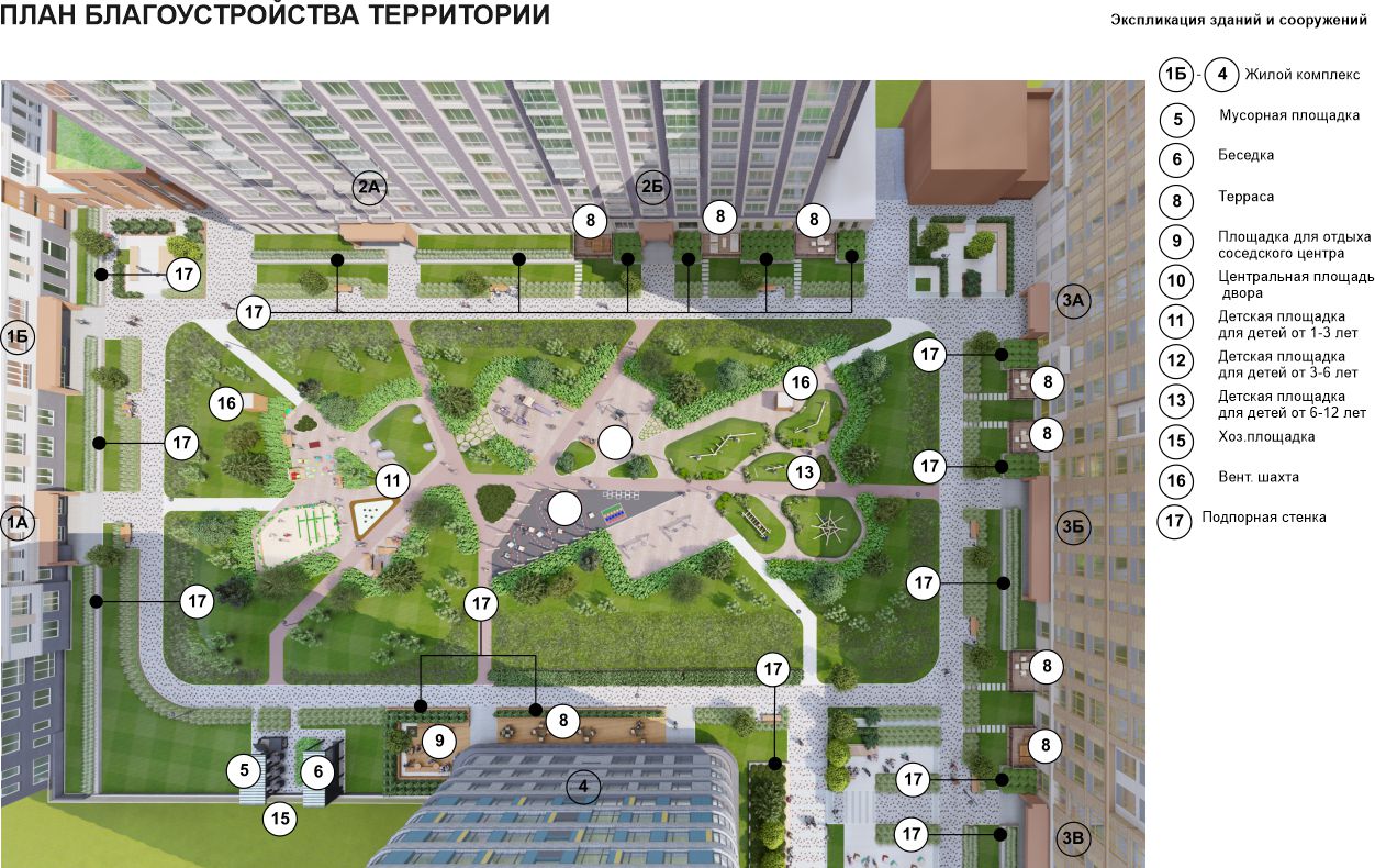 количеством функций: игровые зоны для детей, площадки для отдыха для взрослых, площадь для