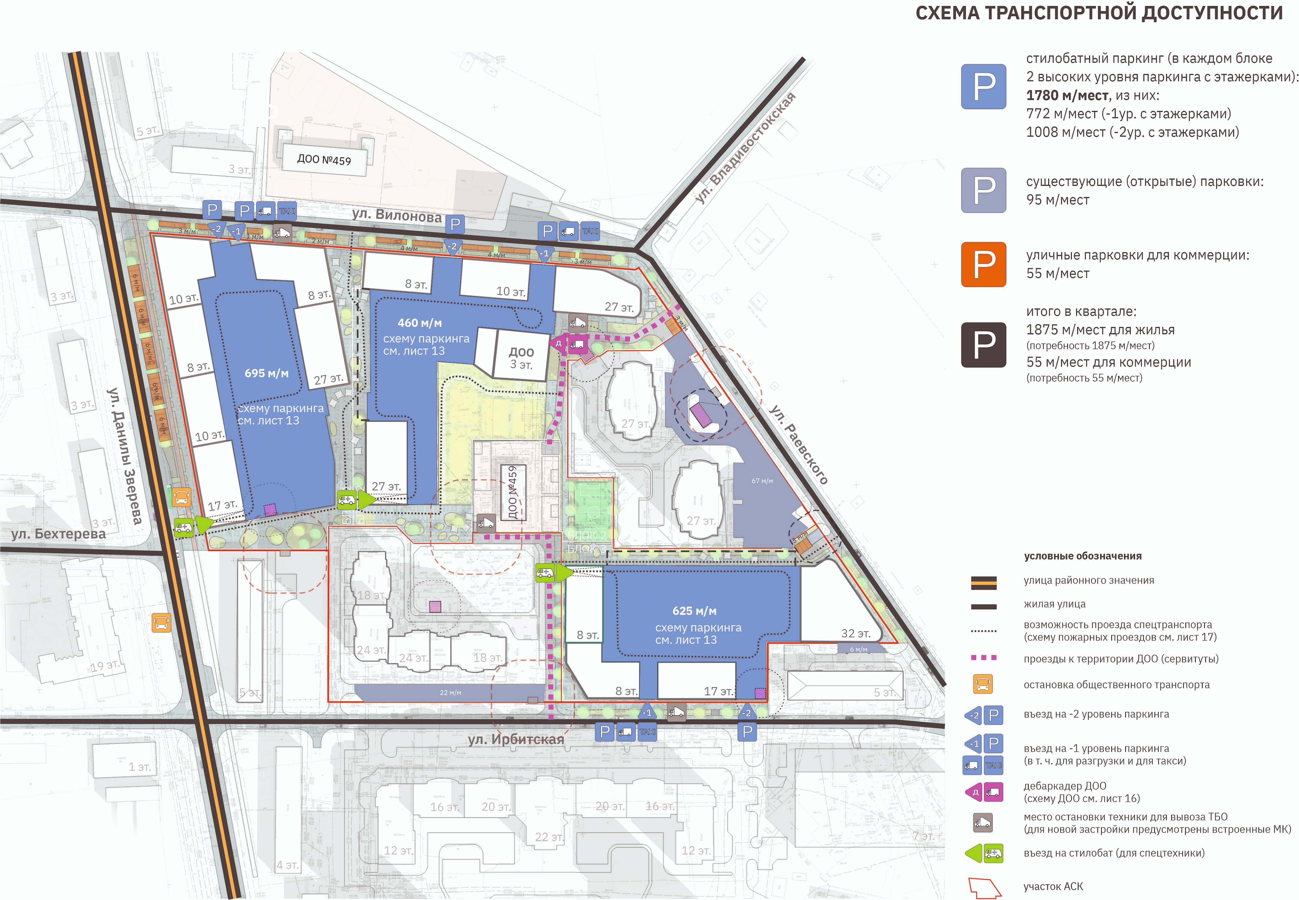 основном застройкой базовой этажности. Основные парковочные места будут расположены в стилобатах зданий, внутри периметральной застройки. Вдоль улиц также будут оборудованы парковки для удобства пользования