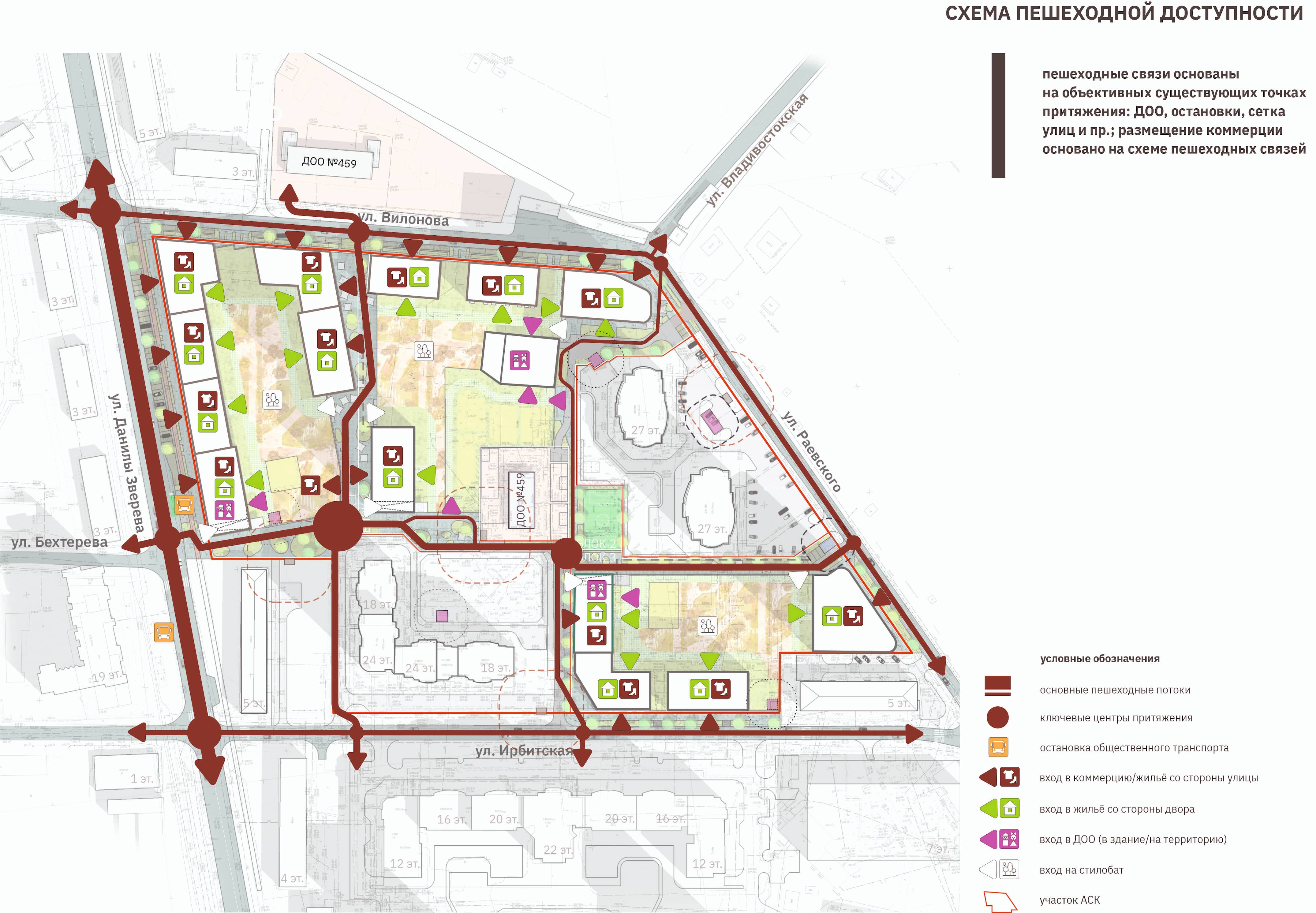 большой выход площади с участка. Сеть пешеходных улиц задает удобные внутриквартальные