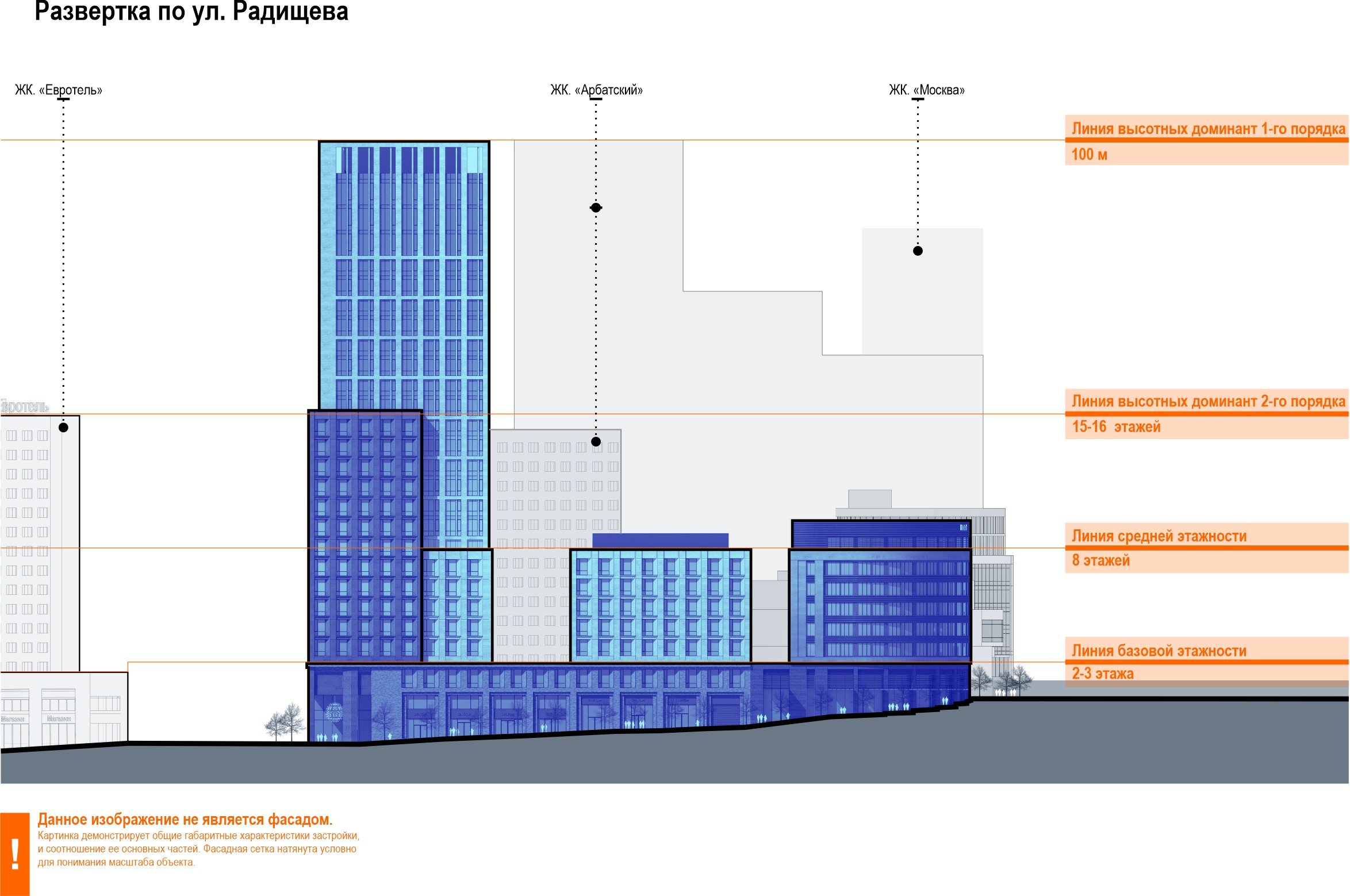 без разрывов, чтобы четко задать контур улицы. Трехэтажная база, соответствующая по